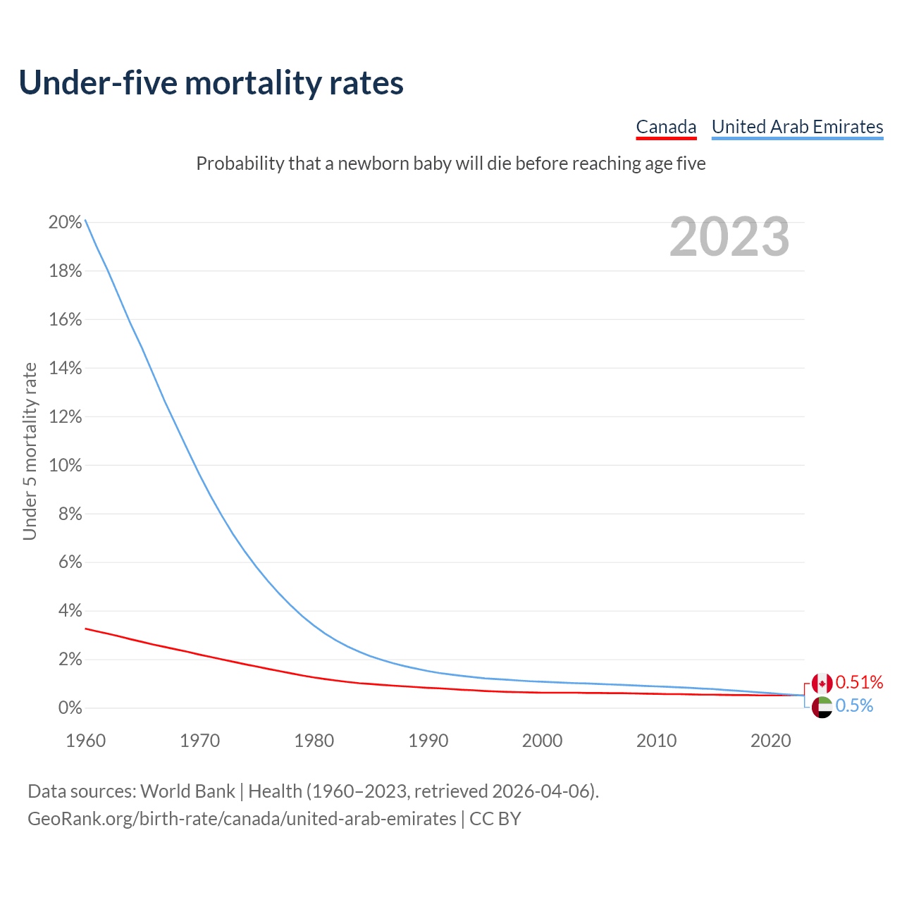 The chance that a newborn baby will die before reaching age five is 0.51% in Canada and 0.5% in the United Arab Emirates. Above is a chart with historical data on under-five mortality rates.