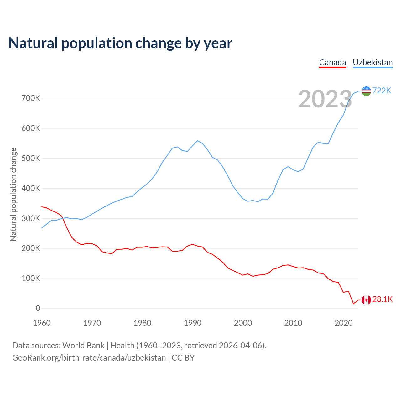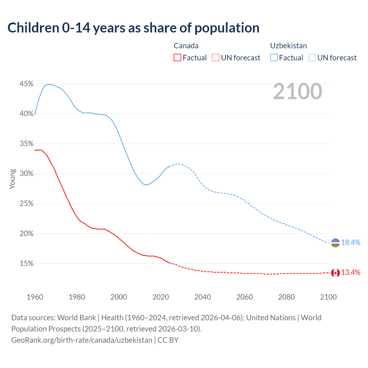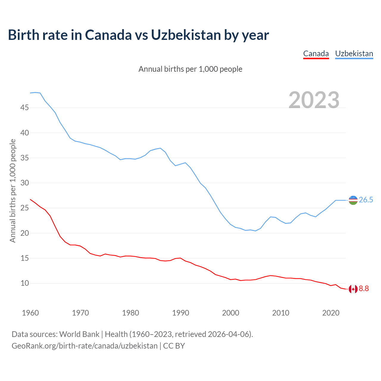 Canada has an annual birth rate of 8.8 births per 1,000 people, compared to 26.5 for Uzbekistan. The average number of children a woman is expected to have during her lifetime — the fertility rate, is 1.26 in Canada and 3.5 in Uzbekistan — 177.8% difference.