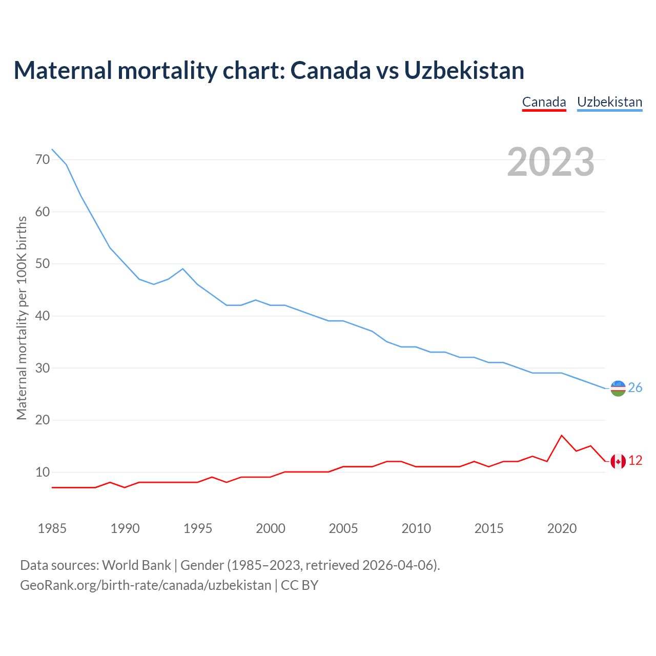 The maternal mortality rate, which is the probability of dying during childbirth or within 42 days of pregnancy termination, is 12 deaths per 100,000 live births in Canada, compared to 26 deaths in Uzbekistan.