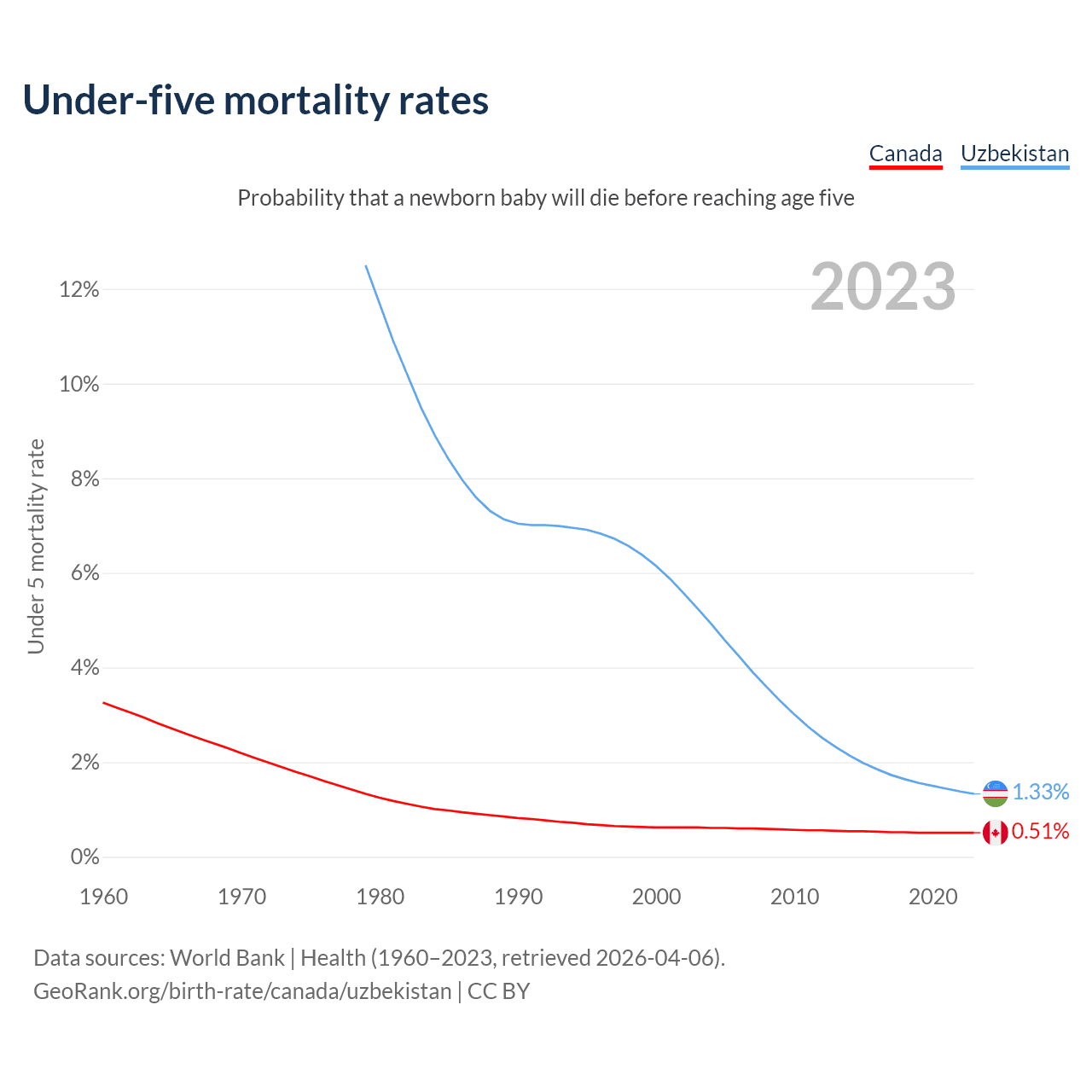 The chance that a newborn baby will die before reaching age five is 0.51% in Canada and 1.33% in Uzbekistan. Above is a chart with historical data on under-five mortality rates.