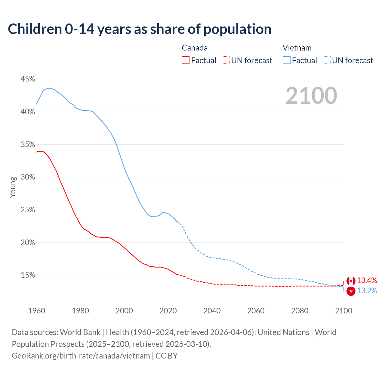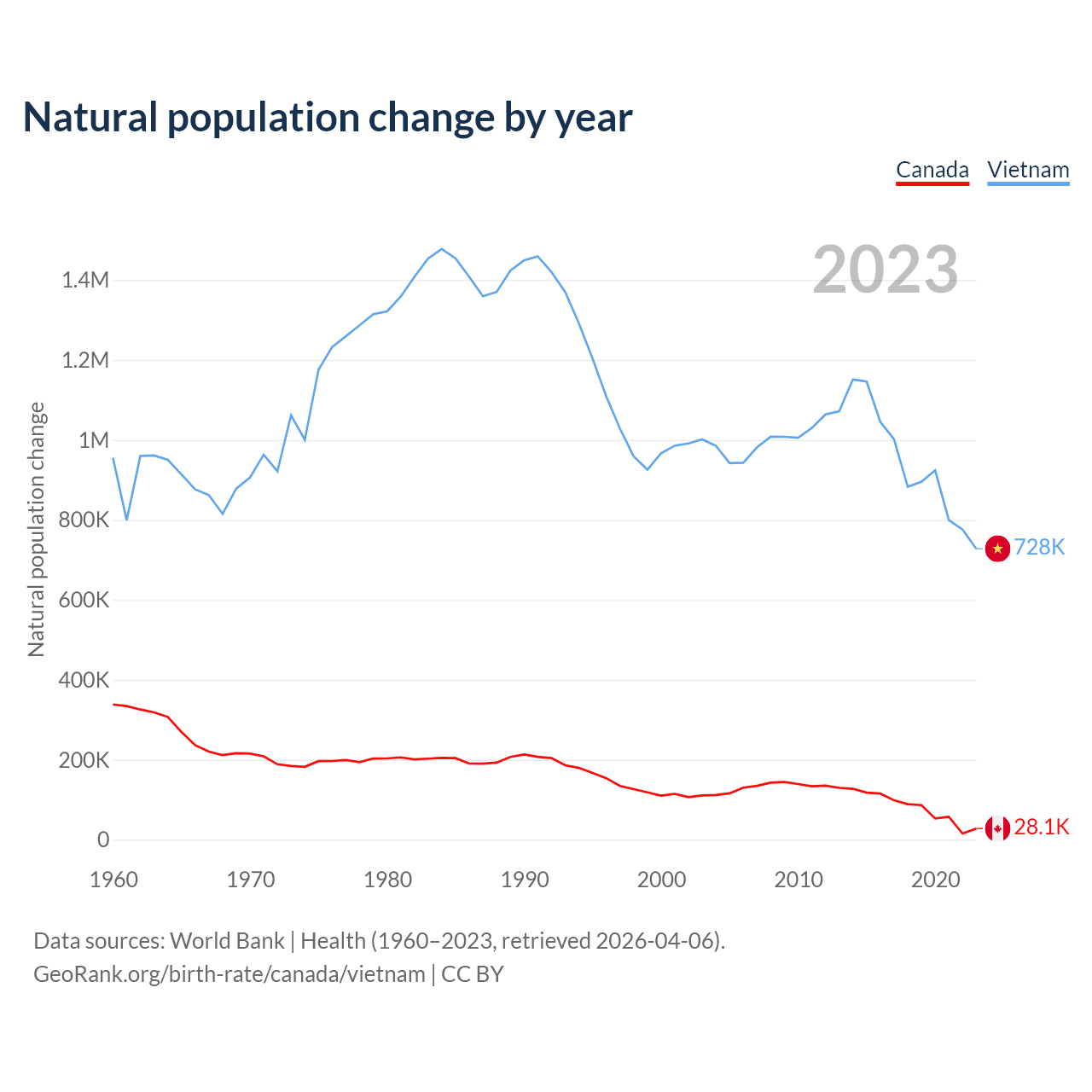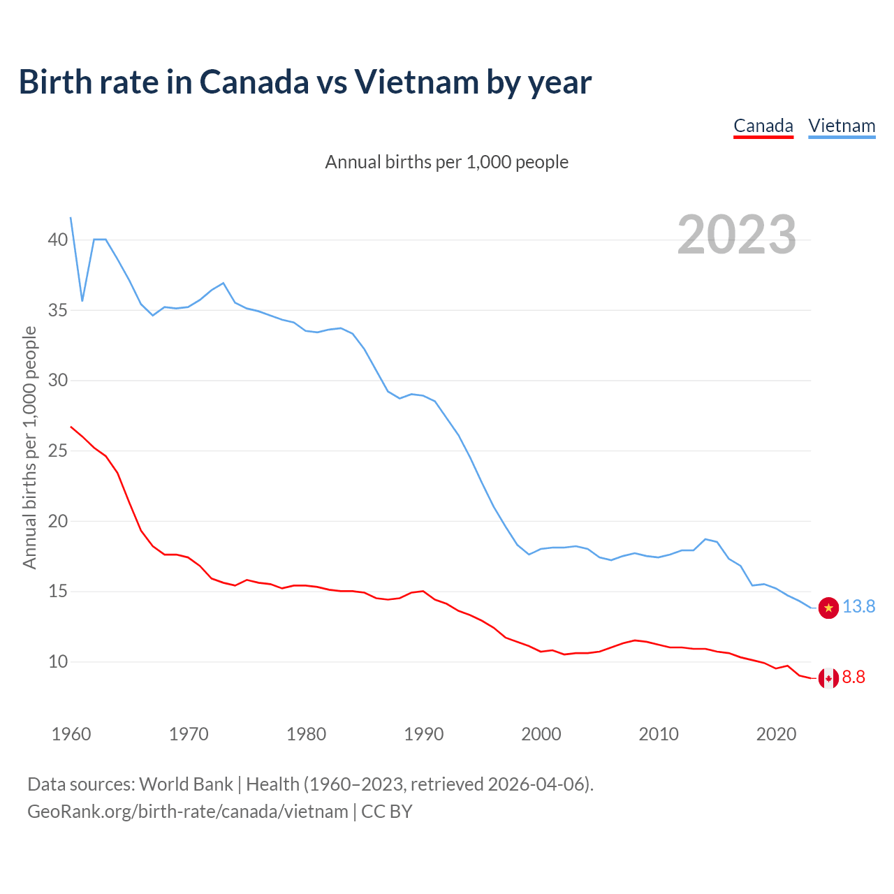 Canada has an annual birth rate of 8.8 births per 1,000 people, compared to 13.8 for Vietnam. The average number of children a woman is expected to have during her lifetime — the fertility rate, is 1.26 in Canada and 1.91 in Vietnam — 51.8% difference.