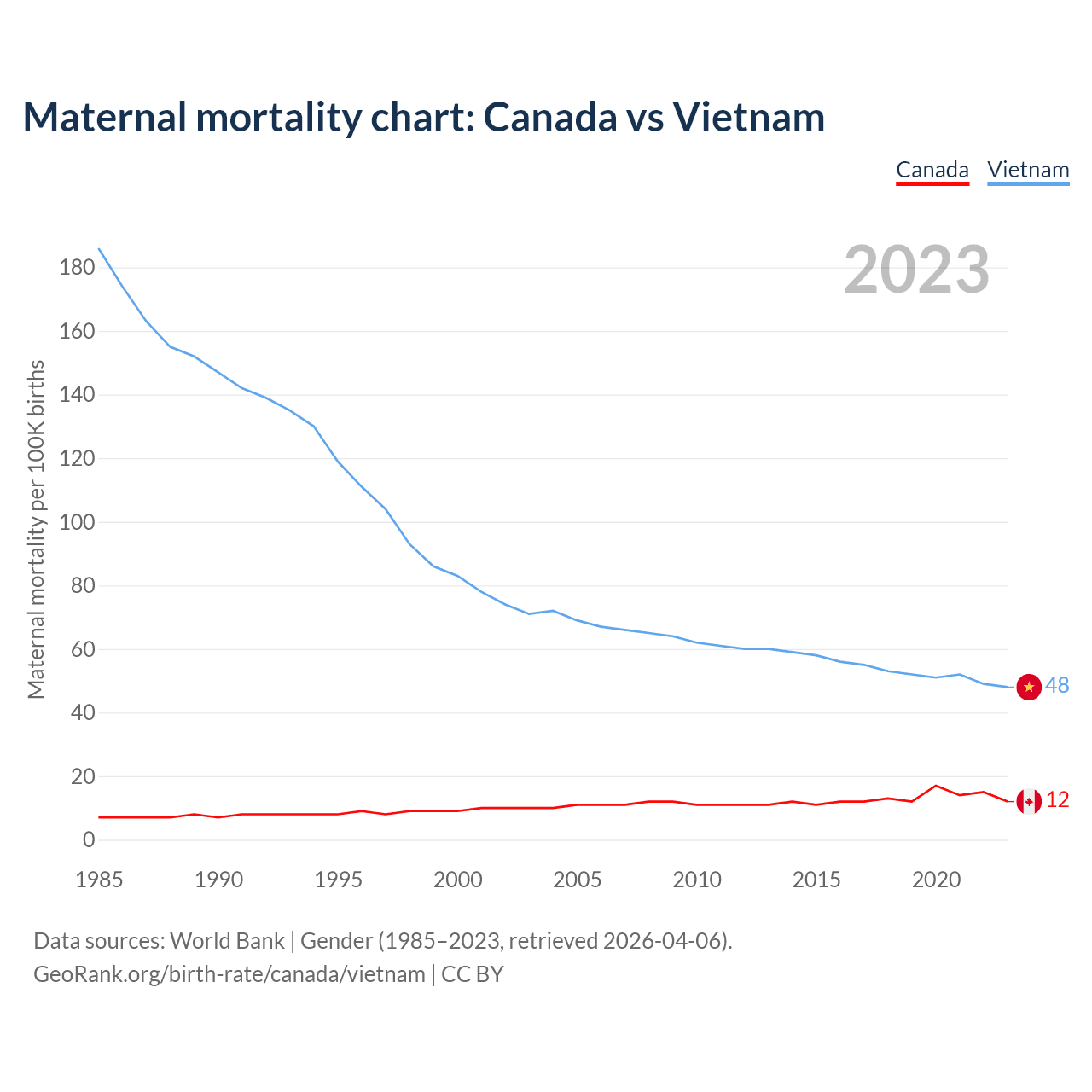 The maternal mortality rate, which is the probability of dying during childbirth or within 42 days of pregnancy termination, is 12 deaths per 100,000 live births in Canada, compared to 48 deaths in Vietnam.