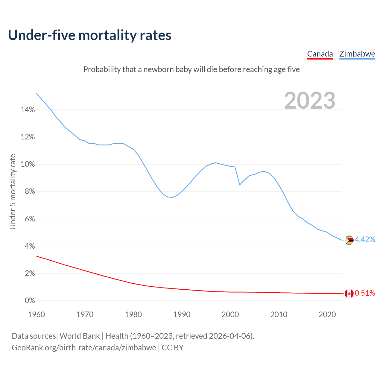 The chance that a newborn baby will die before reaching age five is 0.51% in Canada and 4.42% in Zimbabwe. Above is a chart with historical data on under-five mortality rates.