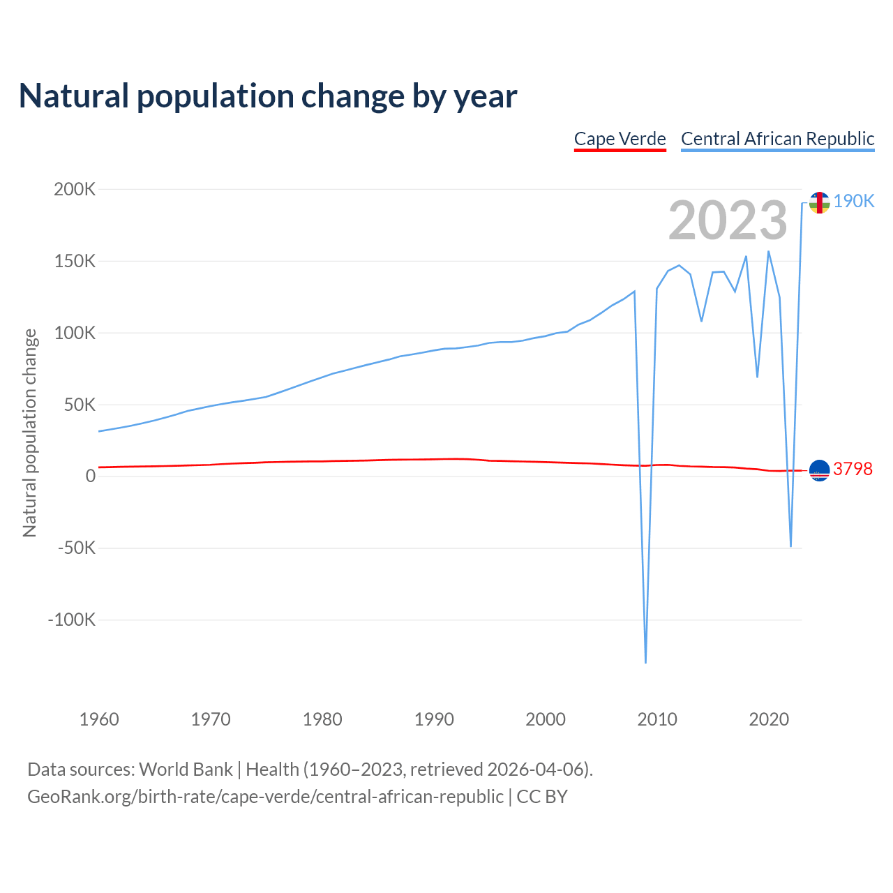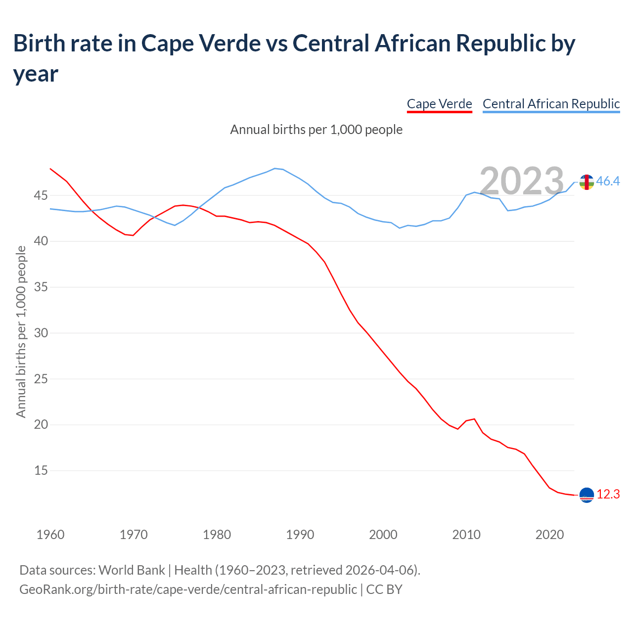Cape Verde has an annual birth rate of 12.3 births per 1,000 people, compared to 46.4 for the Central African Republic. The average number of children a woman is expected to have during her lifetime — the fertility rate, is 1.52 in Cape Verde and 6.01 in the Central African Republic — 295% difference.