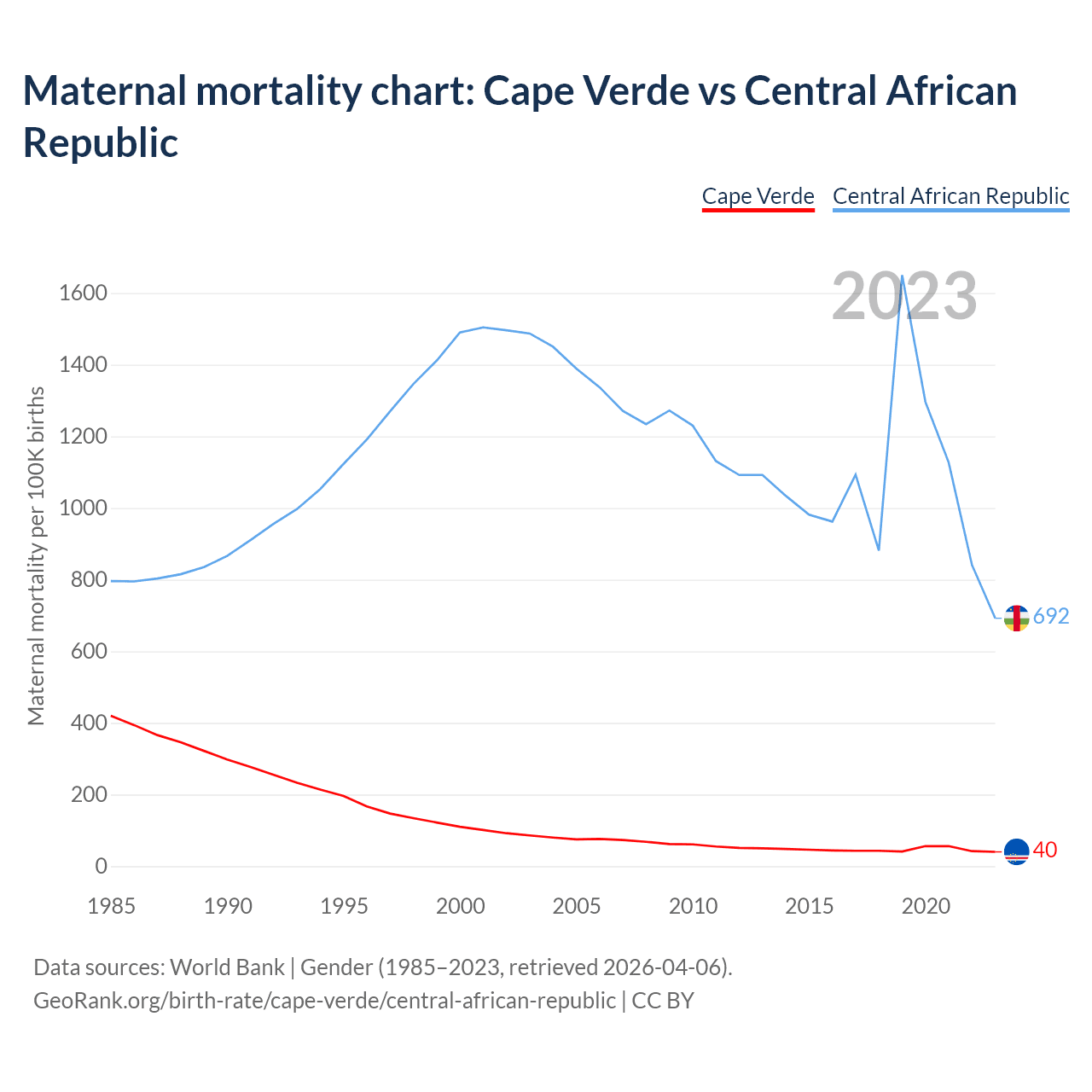 The maternal mortality rate, which is the probability of dying during childbirth or within 42 days of pregnancy termination, is 40 deaths per 100,000 live births in Cape Verde, compared to 692 deaths in the Central African Republic.