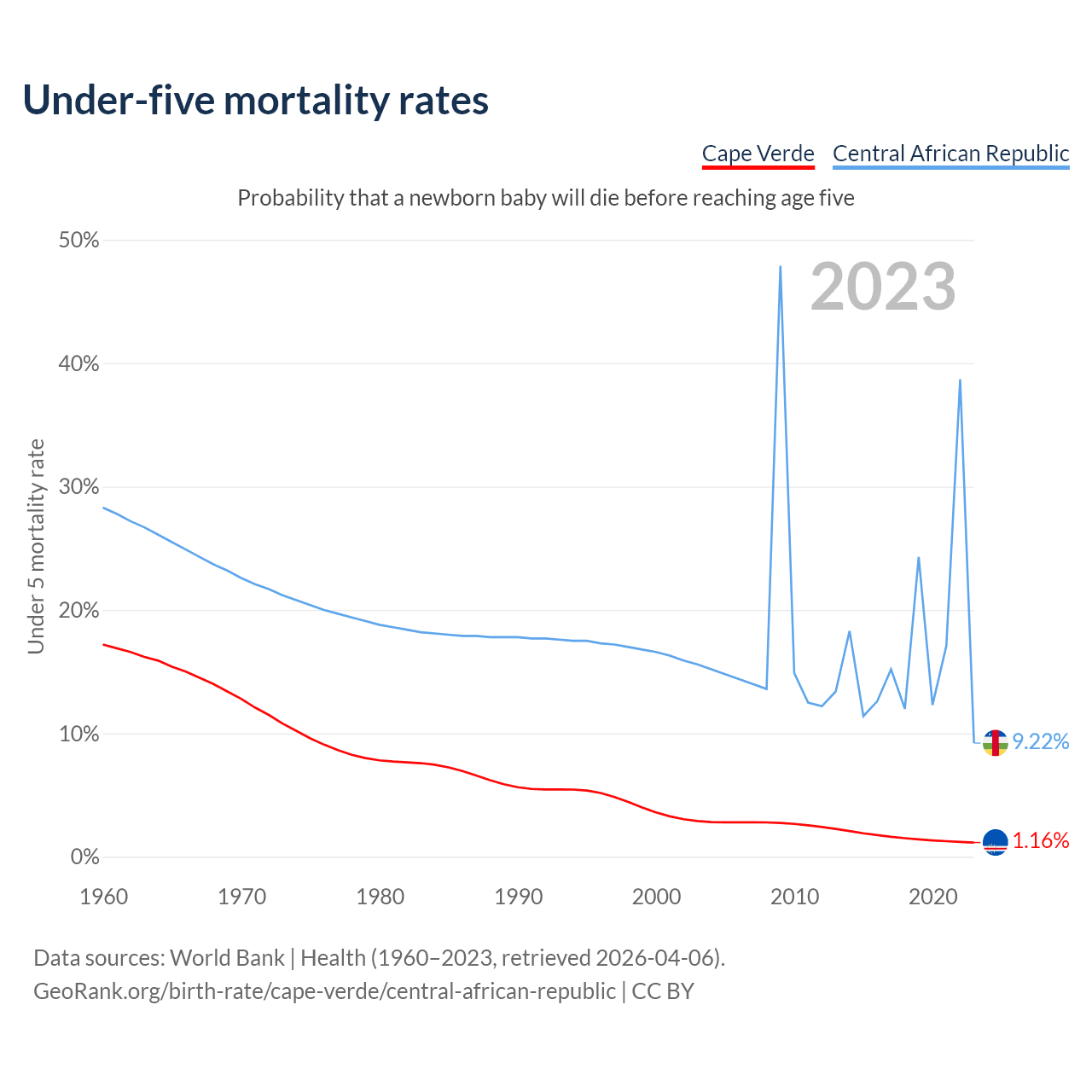 The chance that a newborn baby will die before reaching age five is 1.16% in Cape Verde and 9.22% in the Central African Republic. Above is a chart with historical data on under-five mortality rates.