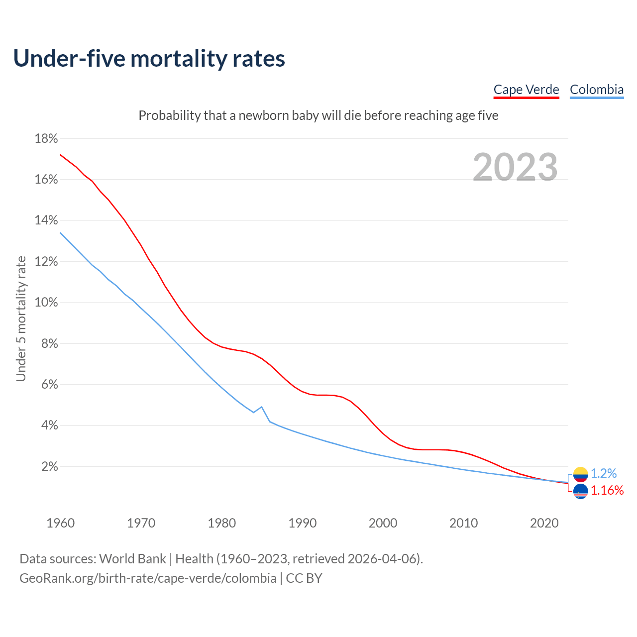 The chance that a newborn baby will die before reaching age five is 1.16% in Cape Verde and 1.2% in Colombia. Above is a chart with historical data on under-five mortality rates.