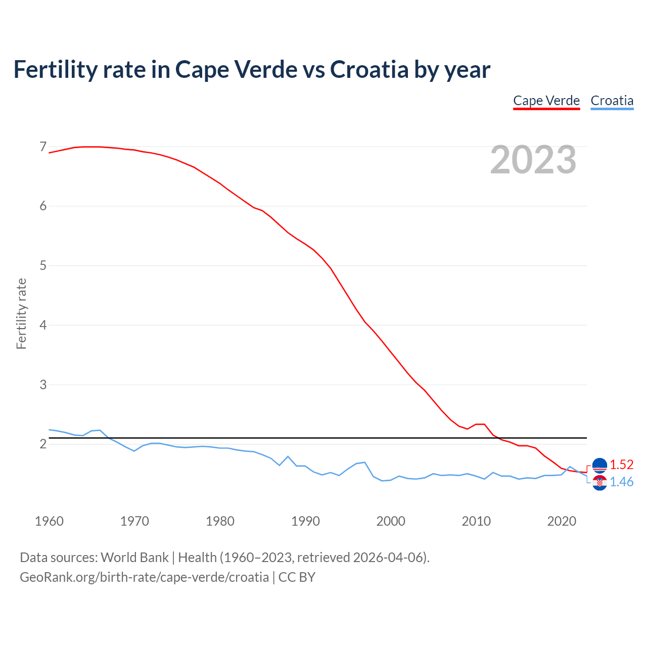 1960 vs 2023, the fertility rate has decreased by 77.9% in Cape Verde and by 34.8% in Croatia — in 1960, it was 6.89 and 2.24, respectively.