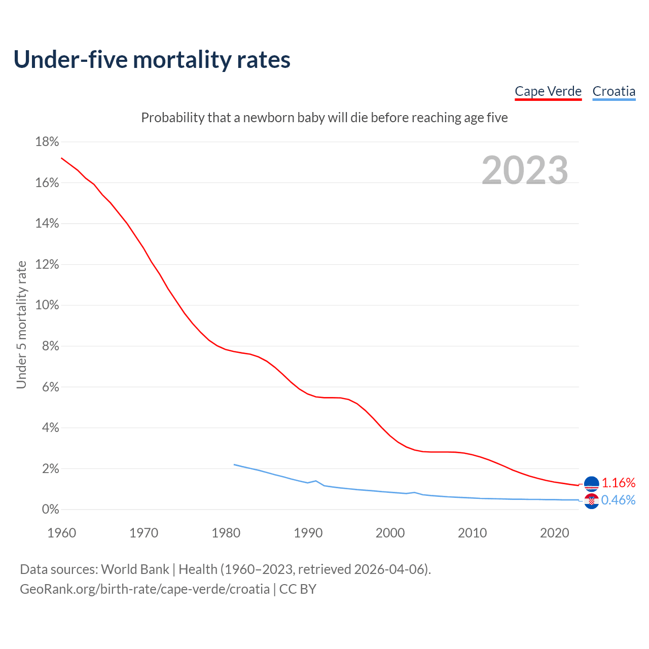 The chance that a newborn baby will die before reaching age five is 1.16% in Cape Verde and 0.46% in Croatia. Above is a chart with historical data on under-five mortality rates.