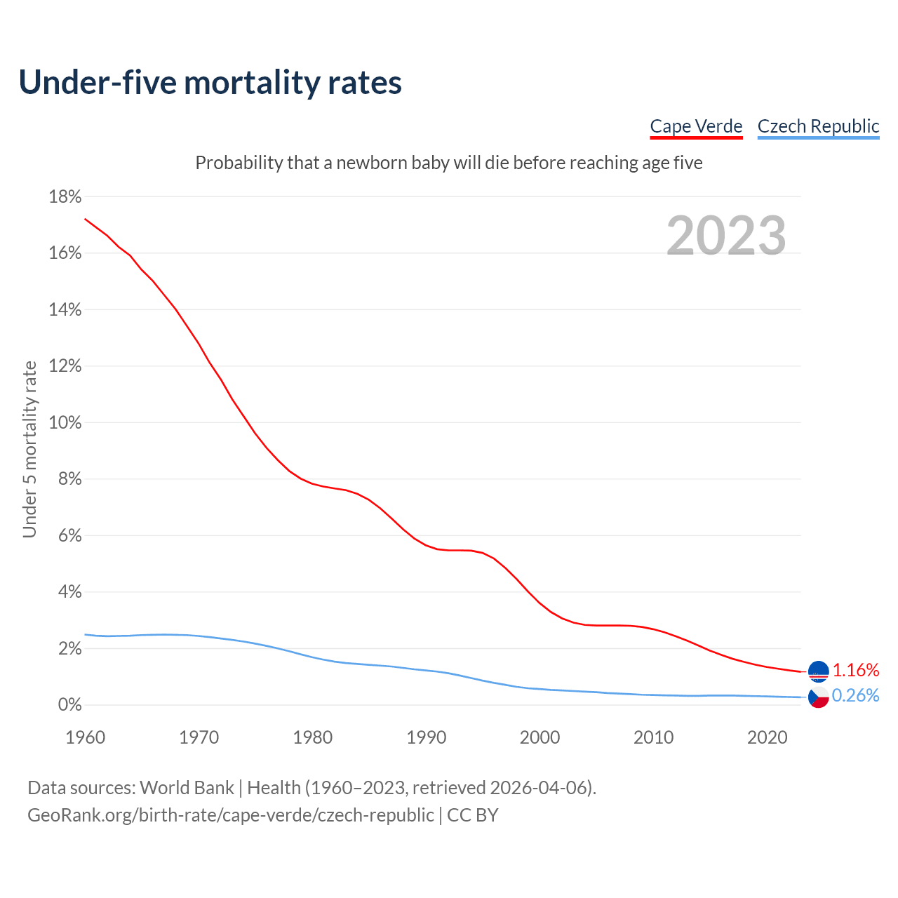 The chance that a newborn baby will die before reaching age five is 1.16% in Cape Verde and 0.26% in the Czech Republic. Above is a chart with historical data on under-five mortality rates.