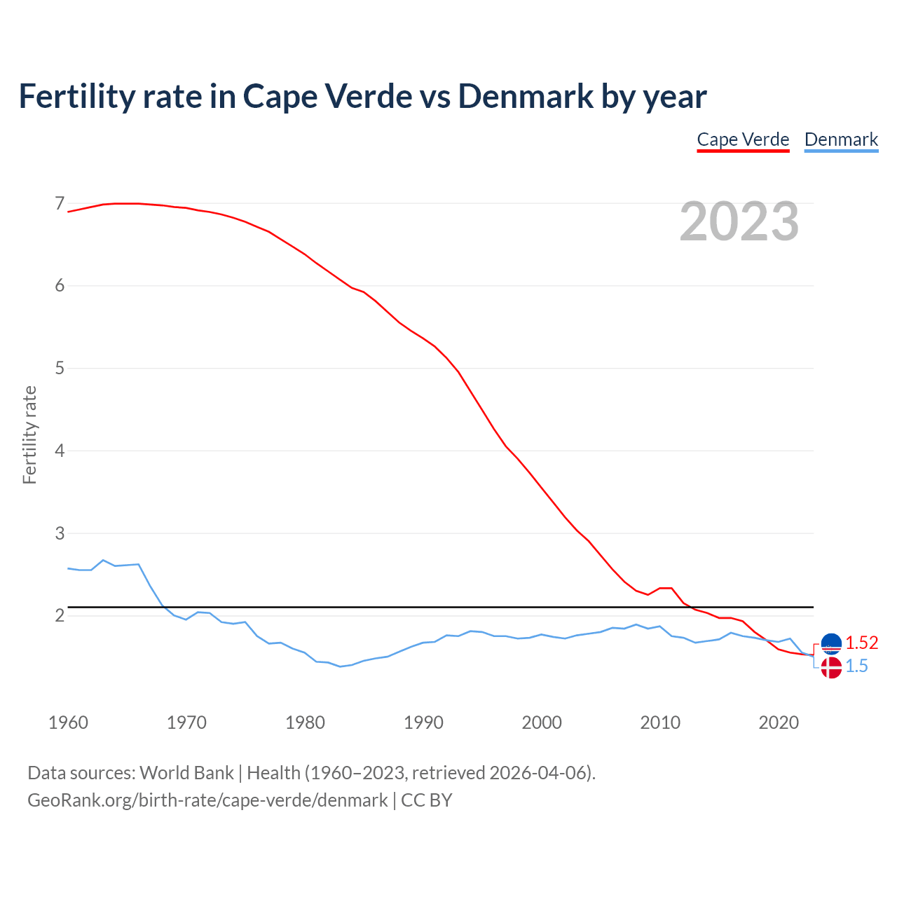 According to the latest available data on birth rates, the fertility rate in Cape Verde was 1.52 children per woman in 2023, compared to 1.5 in Denmark in 2023. The replacement level is considered to be 2.1 children per woman.