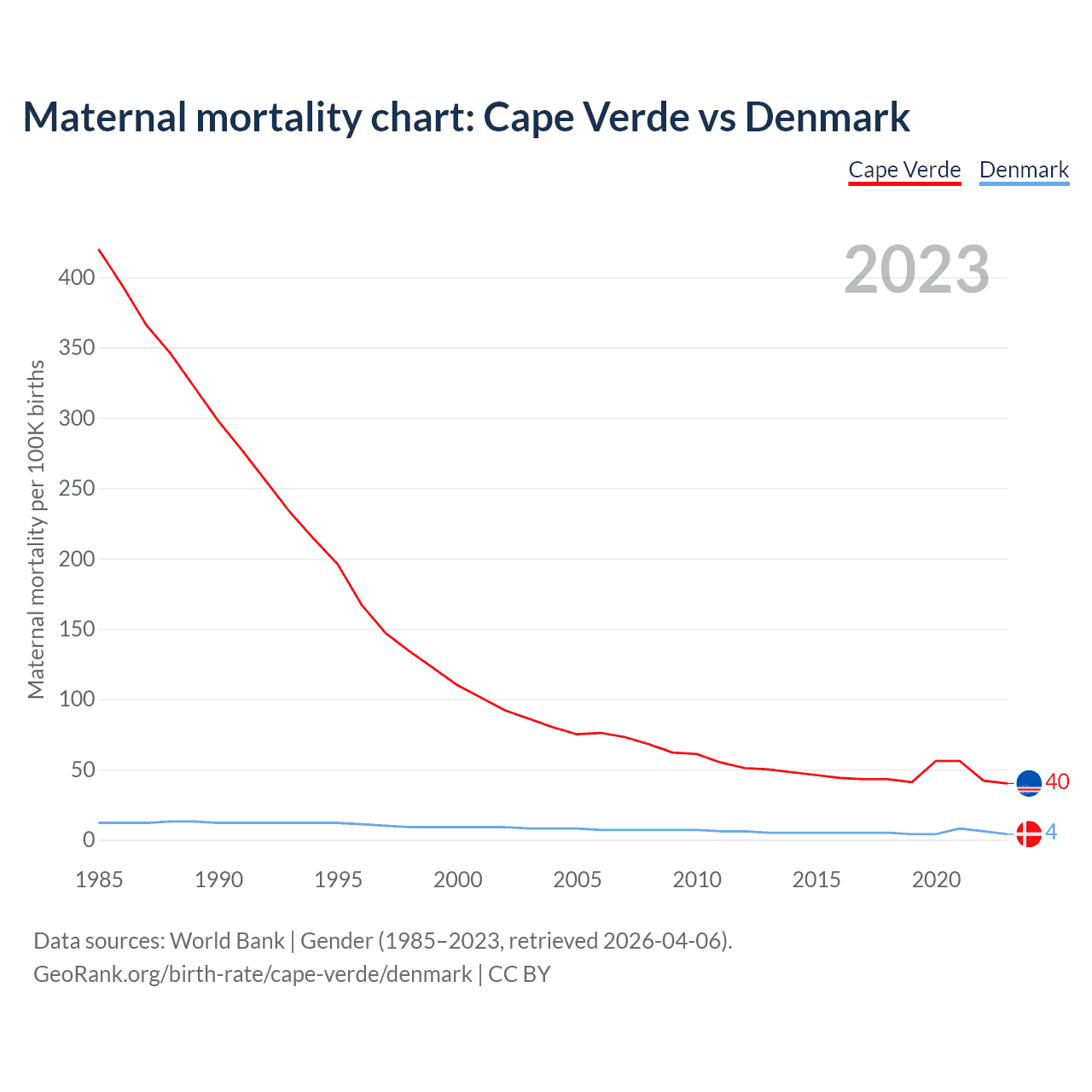 The maternal mortality rate, which is the probability of dying during childbirth or within 42 days of pregnancy termination, is 40 deaths per 100,000 live births in Cape Verde, compared to 4 deaths in Denmark.