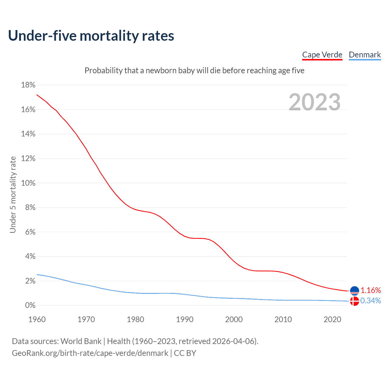 The chance that a newborn baby will die before reaching age five is 1.16% in Cape Verde and 0.34% in Denmark. Above is a chart with historical data on under-five mortality rates.