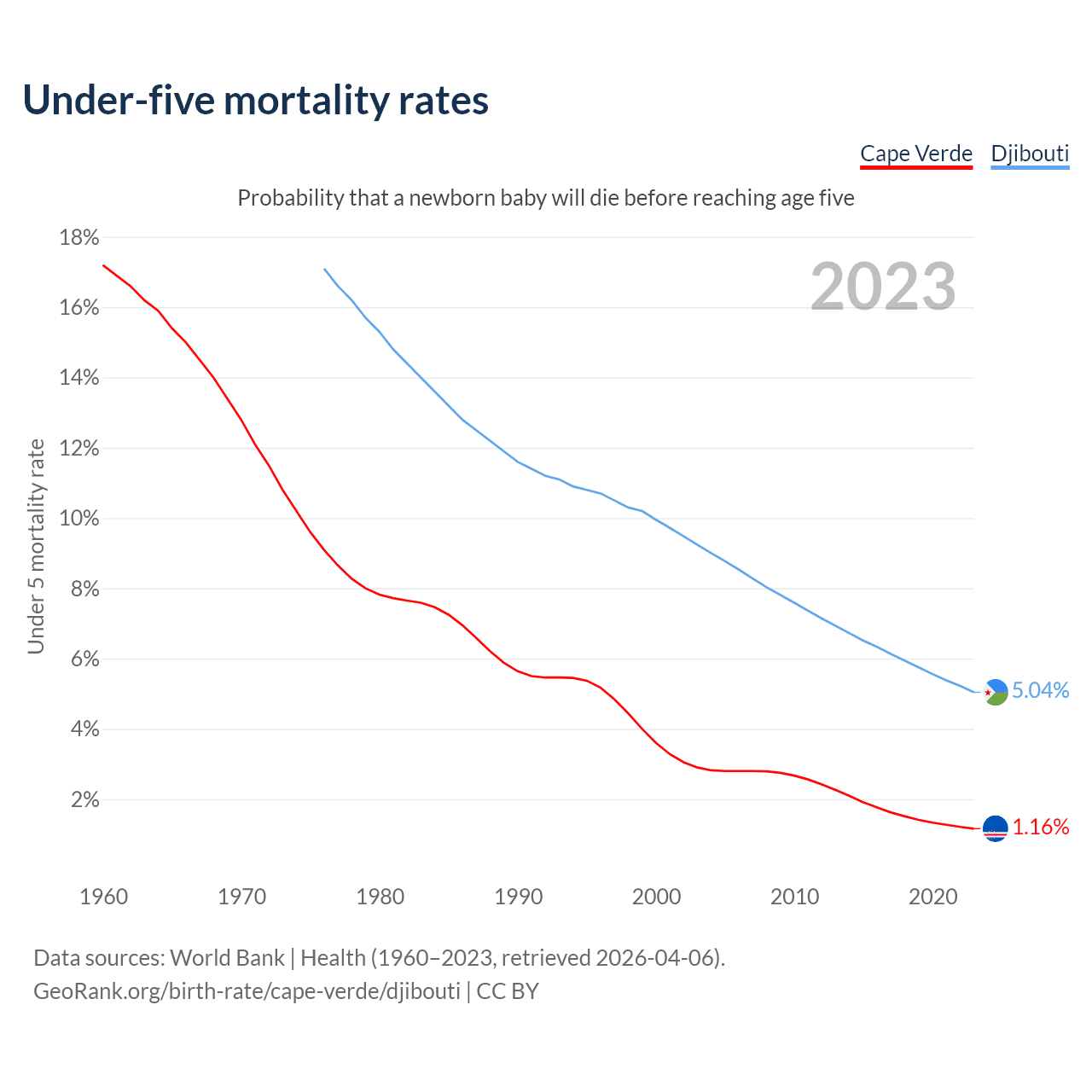 The chance that a newborn baby will die before reaching age five is 1.16% in Cape Verde and 5.04% in Djibouti. Above is a chart with historical data on under-five mortality rates.