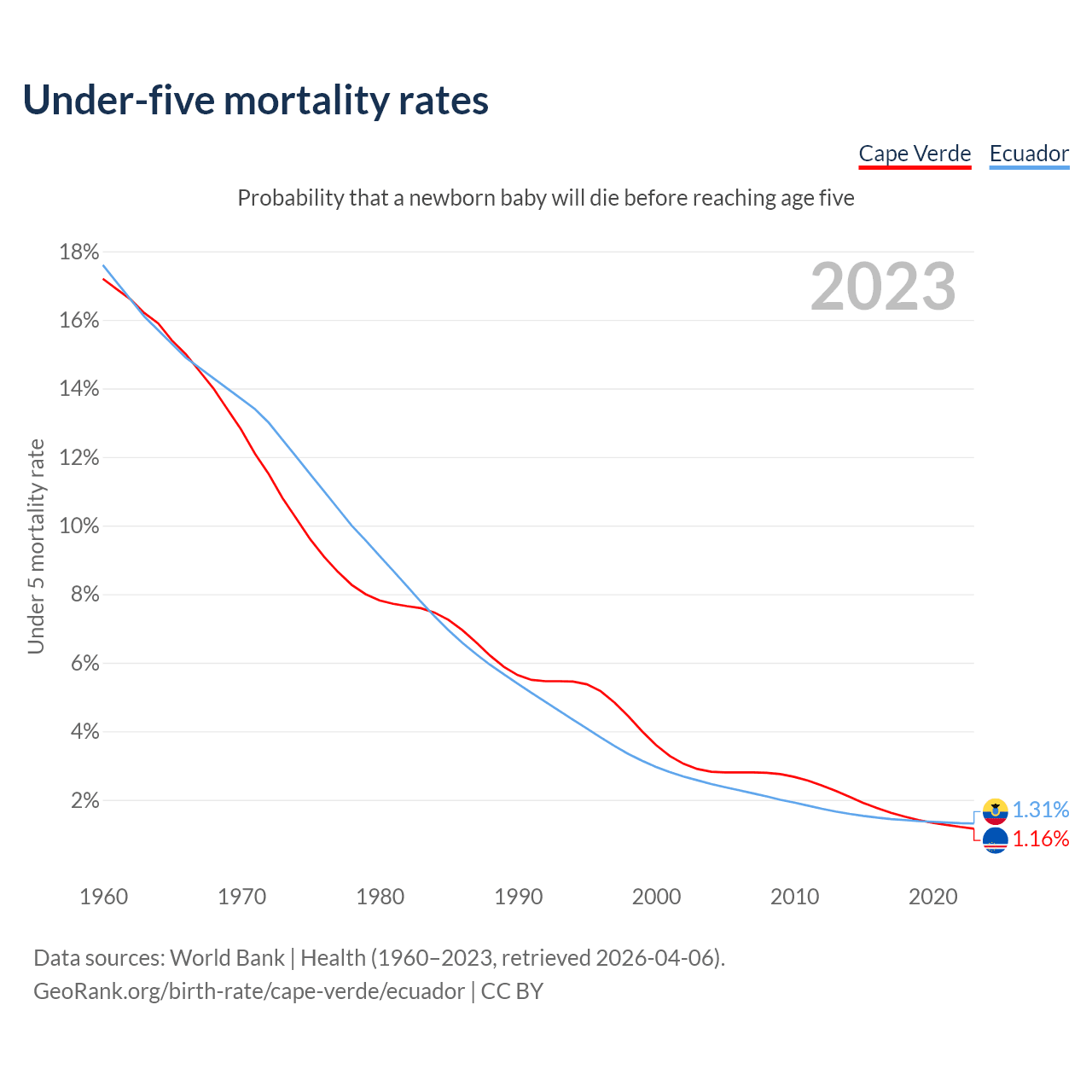 The chance that a newborn baby will die before reaching age five is 1.16% in Cape Verde and 1.31% in Ecuador. Above is a chart with historical data on under-five mortality rates.