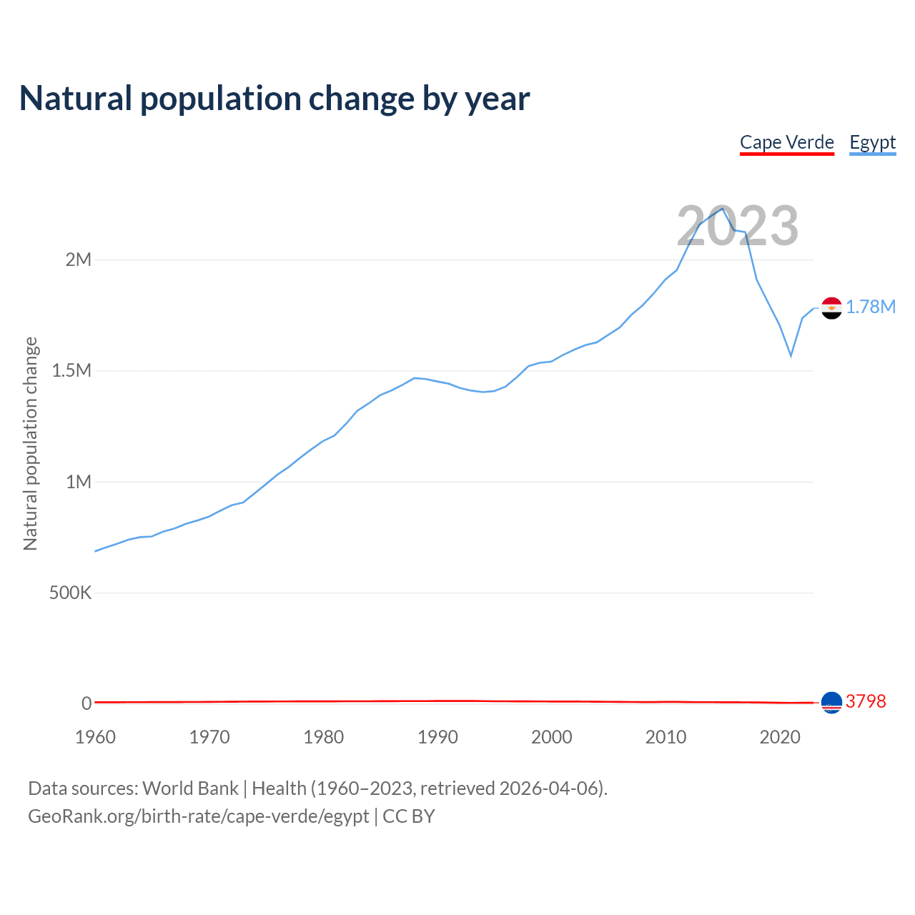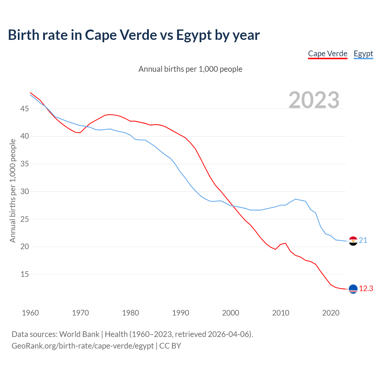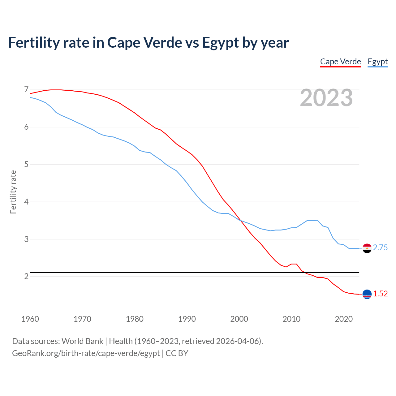 Cape Verde has an annual birth rate of 12.3 births per 1,000 people, compared to 21 for Egypt. The average number of children a woman is expected to have during her lifetime — the fertility rate, is 1.52 in Cape Verde and 2.75 in Egypt — 80.7% difference.