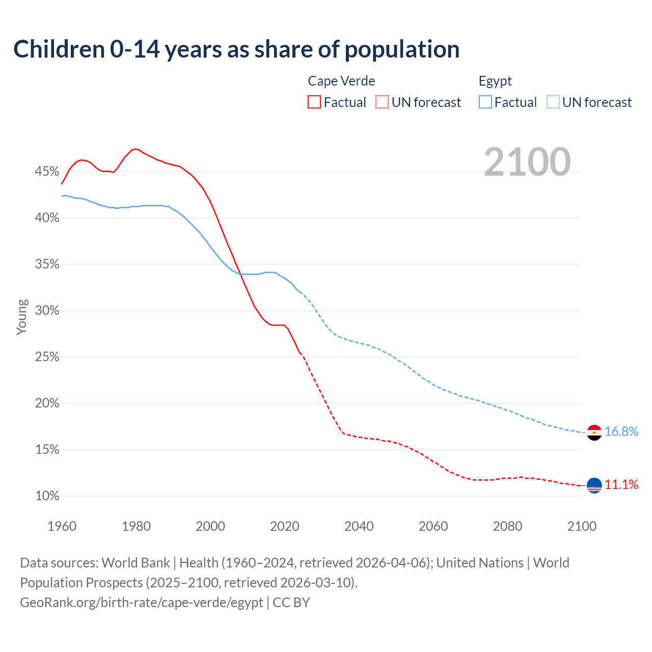 According to the latest available data on birth rates, the fertility rate in Cape Verde was 1.52 children per woman in 2023, compared to 2.75 in Egypt in 2023. The replacement level is considered to be 2.1 children per woman.