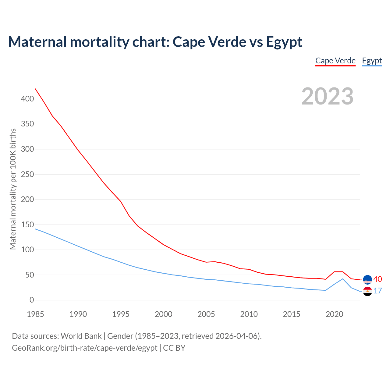 The maternal mortality rate, which is the probability of dying during childbirth or within 42 days of pregnancy termination, is 40 deaths per 100,000 live births in Cape Verde, compared to 17 deaths in Egypt.