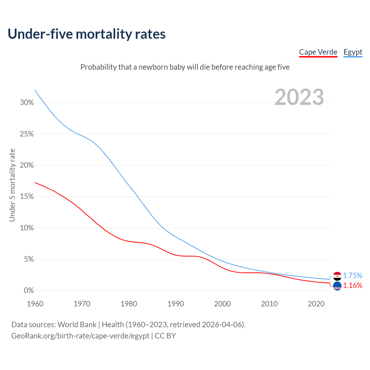The chance that a newborn baby will die before reaching age five is 1.16% in Cape Verde and 1.75% in Egypt. Above is a chart with historical data on under-five mortality rates.