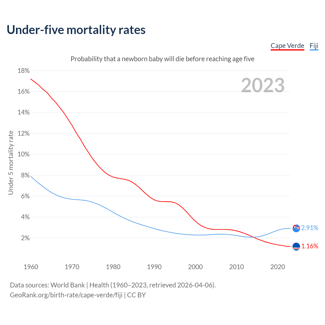 The chance that a newborn baby will die before reaching age five is 1.16% in Cape Verde and 2.91% in Fiji. Above is a chart with historical data on under-five mortality rates.