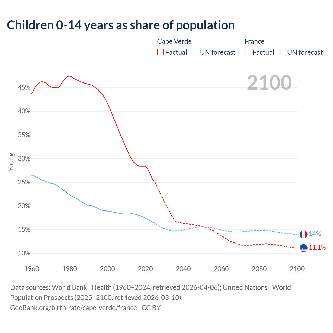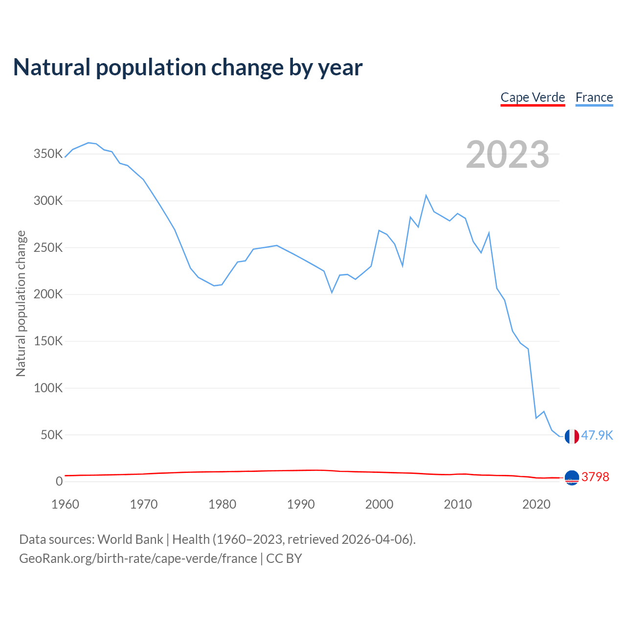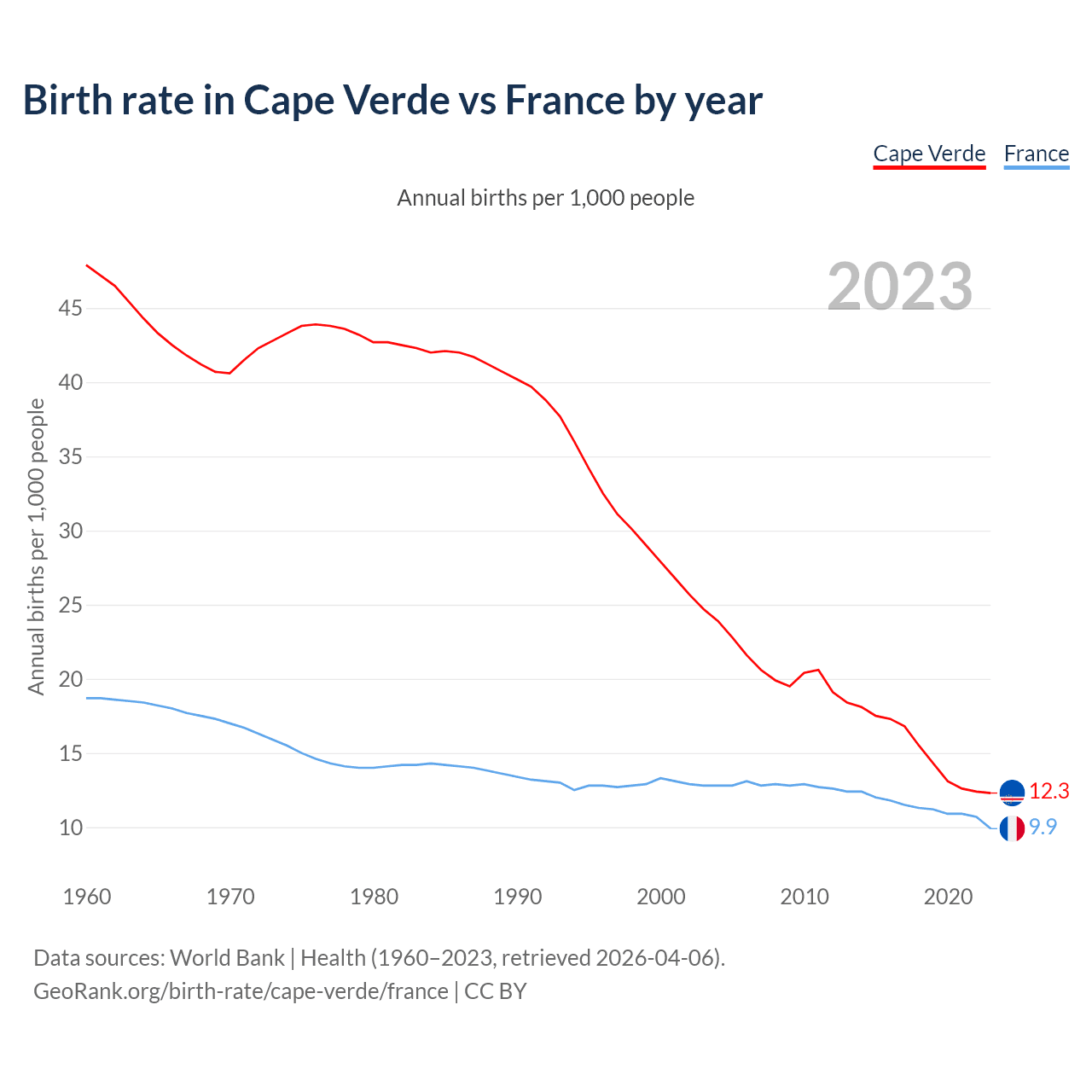 Cape Verde has an annual birth rate of 12.3 births per 1,000 people, compared to 9.9 for France. The average number of children a woman is expected to have during her lifetime — the fertility rate, is 1.52 in Cape Verde and 1.66 in France — 9.07% difference.