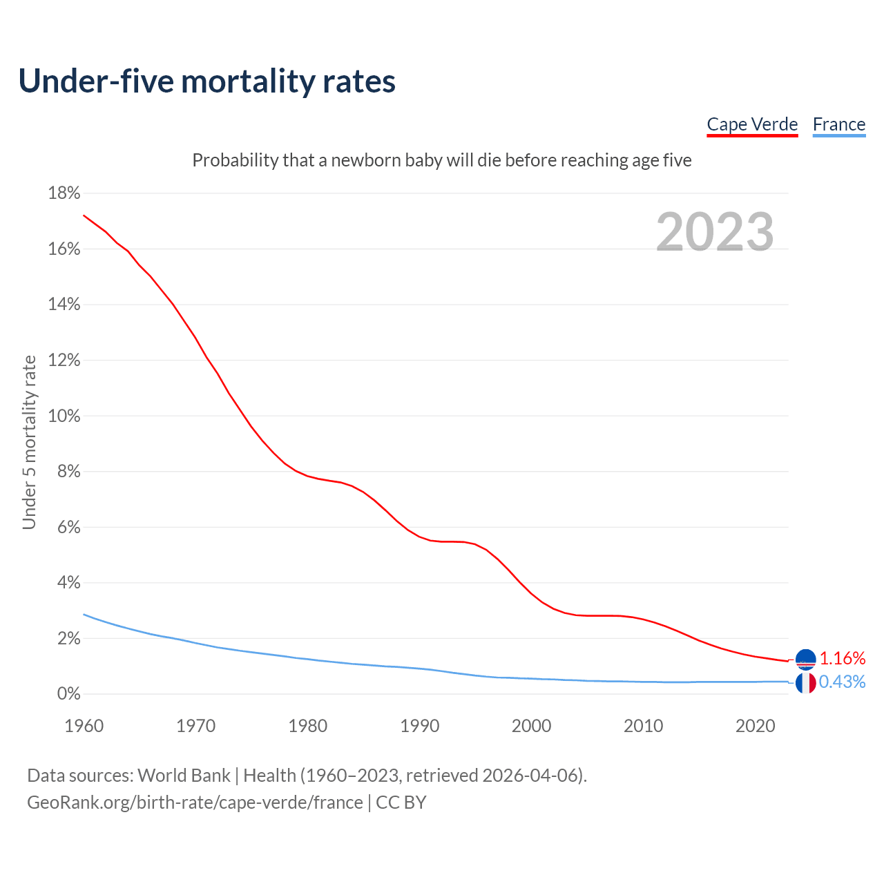 The chance that a newborn baby will die before reaching age five is 1.16% in Cape Verde and 0.43% in France. Above is a chart with historical data on under-five mortality rates.