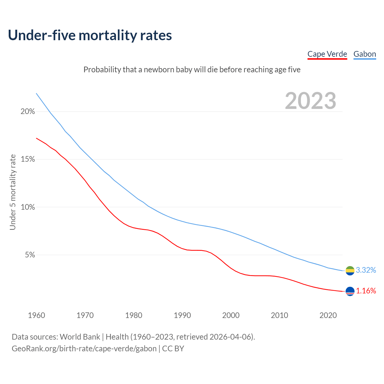 The chance that a newborn baby will die before reaching age five is 1.16% in Cape Verde and 3.32% in Gabon. Above is a chart with historical data on under-five mortality rates.