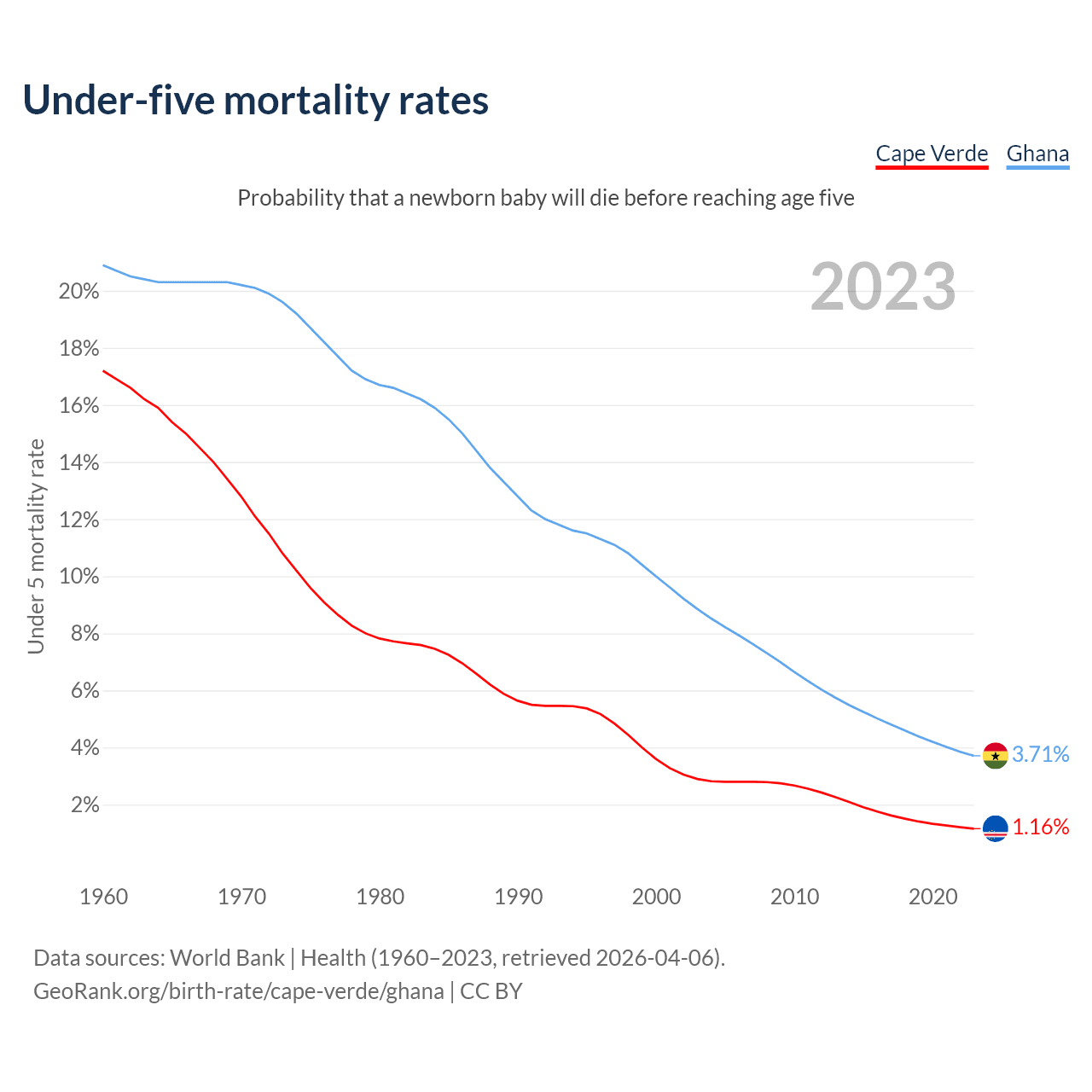 The chance that a newborn baby will die before reaching age five is 1.16% in Cape Verde and 3.71% in Ghana. Above is a chart with historical data on under-five mortality rates.