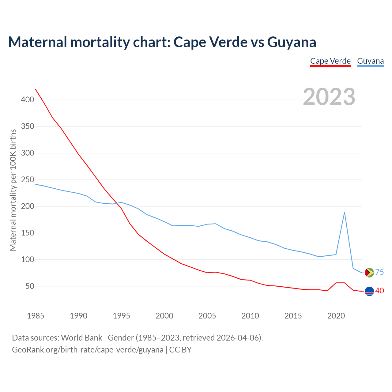 The maternal mortality rate, which is the probability of dying during childbirth or within 42 days of pregnancy termination, is 40 deaths per 100,000 live births in Cape Verde, compared to 75 deaths in Guyana.