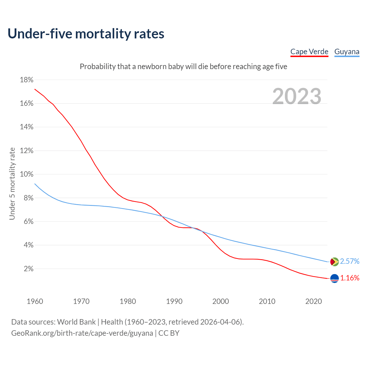 The chance that a newborn baby will die before reaching age five is 1.16% in Cape Verde and 2.57% in Guyana. Above is a chart with historical data on under-five mortality rates.