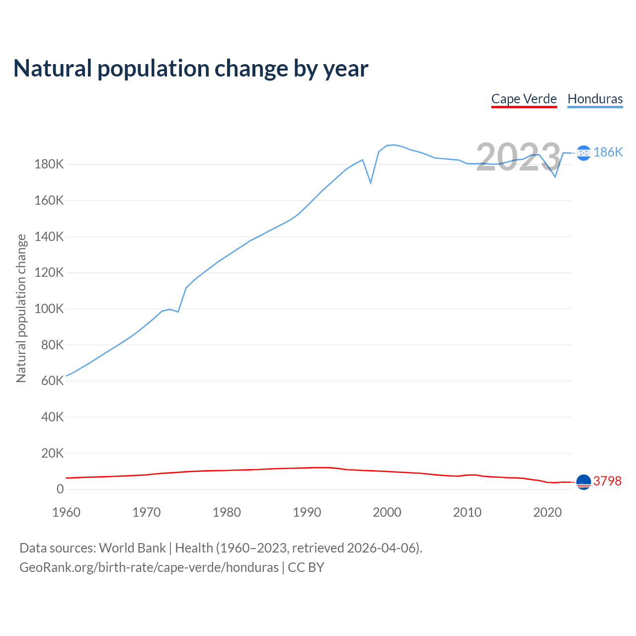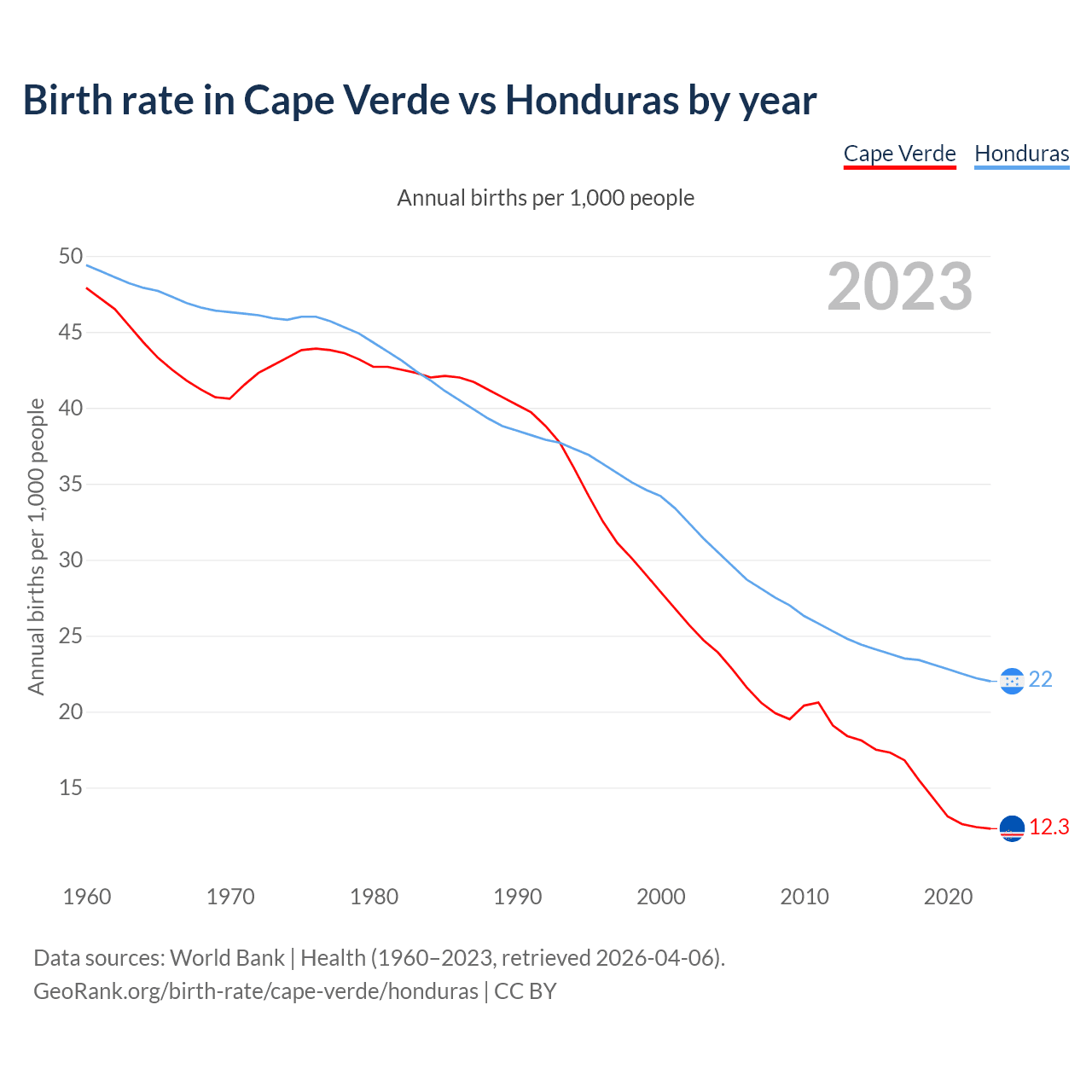 Cape Verde has an annual birth rate of 12.3 births per 1,000 people, compared to 22 for Honduras. The average number of children a woman is expected to have during her lifetime — the fertility rate, is 1.52 in Cape Verde and 2.5 in Honduras — 64.3% difference.