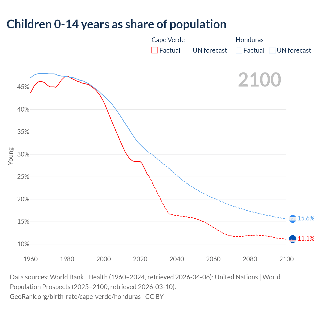 According to the latest available data on birth rates, the fertility rate in Cape Verde was 1.52 children per woman in 2023, compared to 2.5 in Honduras in 2023. The replacement level is considered to be 2.1 children per woman.
