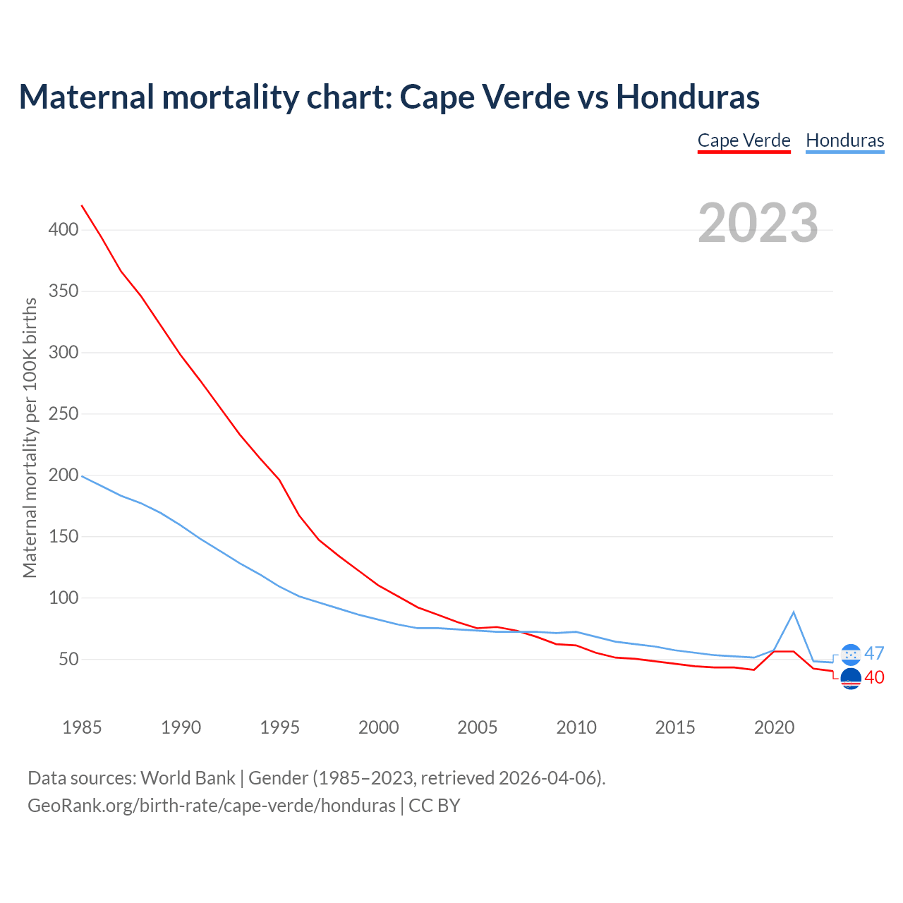 The maternal mortality rate, which is the probability of dying during childbirth or within 42 days of pregnancy termination, is 40 deaths per 100,000 live births in Cape Verde, compared to 47 deaths in Honduras.