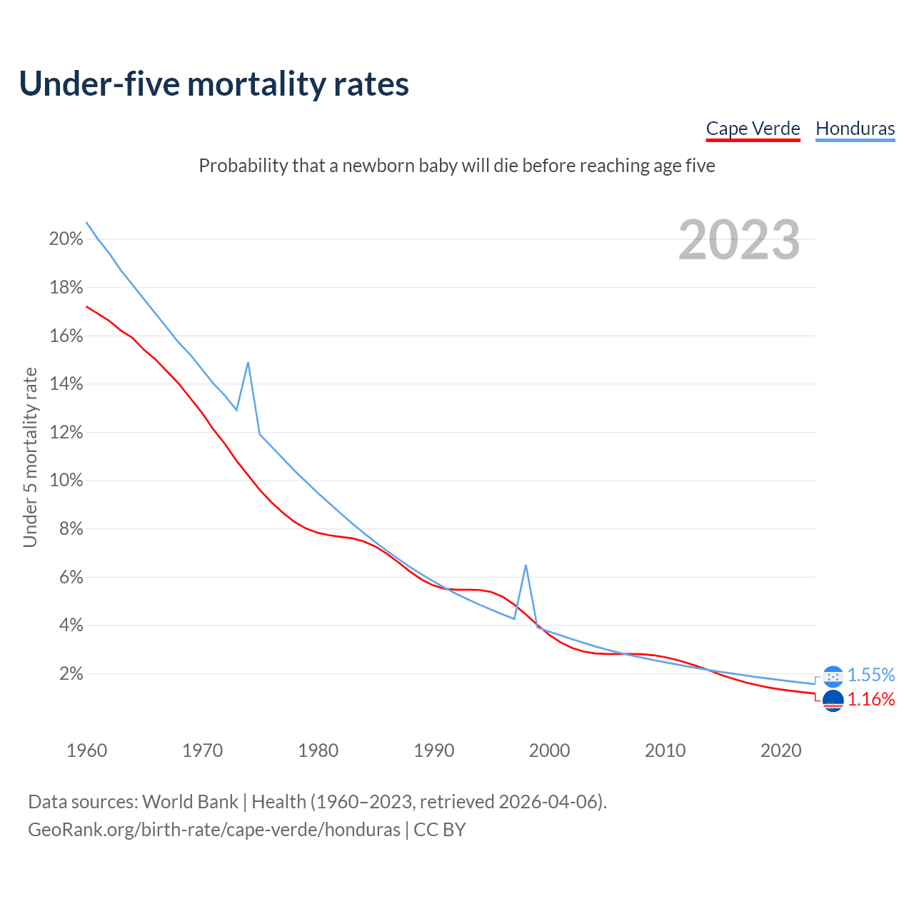 The chance that a newborn baby will die before reaching age five is 1.16% in Cape Verde and 1.55% in Honduras. Above is a chart with historical data on under-five mortality rates.