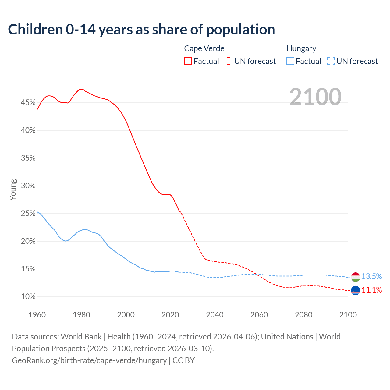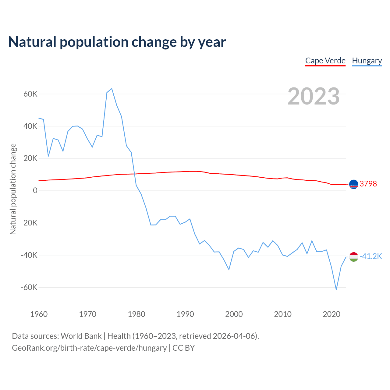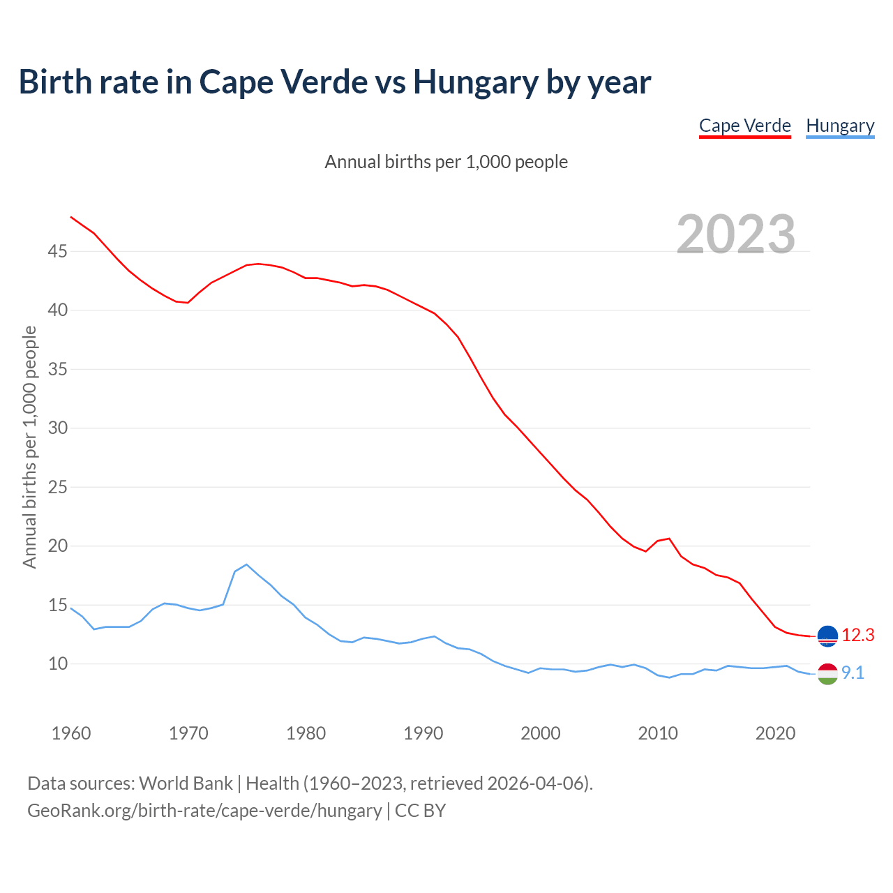 Cape Verde has an annual birth rate of 12.3 births per 1,000 people, compared to 9.1 for Hungary. The average number of children a woman is expected to have during her lifetime — the fertility rate, is 1.52 in Cape Verde and 1.51 in Hungary — 0.79% difference.