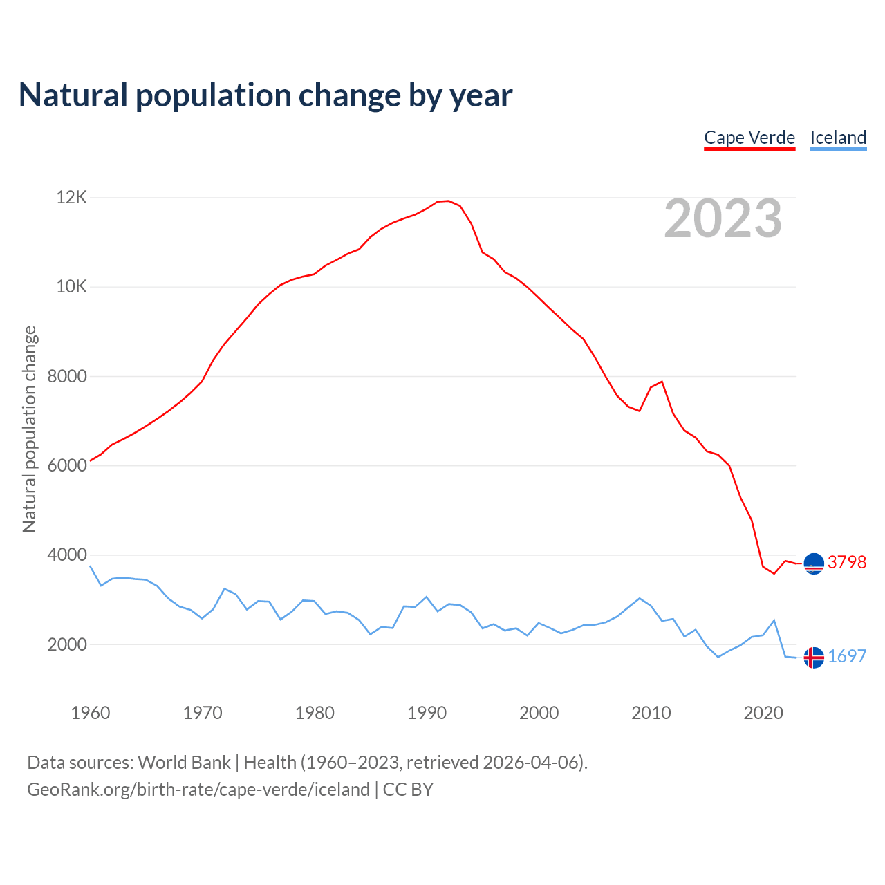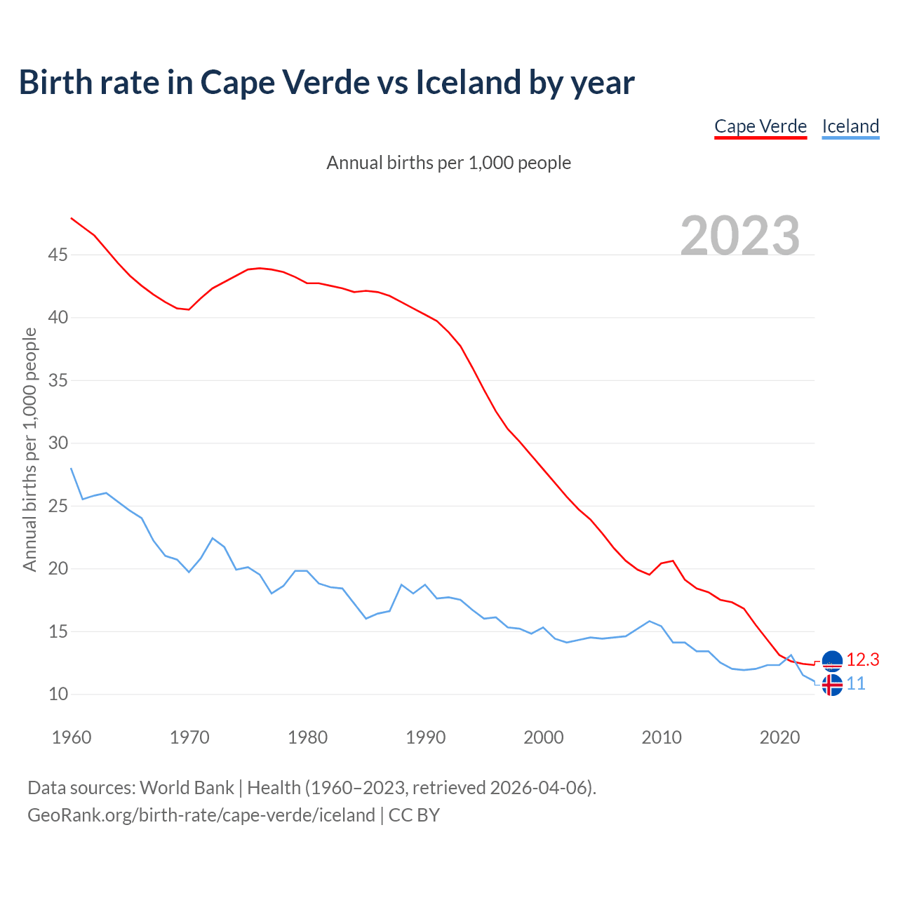 Cape Verde has an annual birth rate of 12.3 births per 1,000 people, compared to 11 for Iceland. The average number of children a woman is expected to have during her lifetime — the fertility rate, is 1.52 in Cape Verde and 1.59 in Iceland — 4.47% difference.