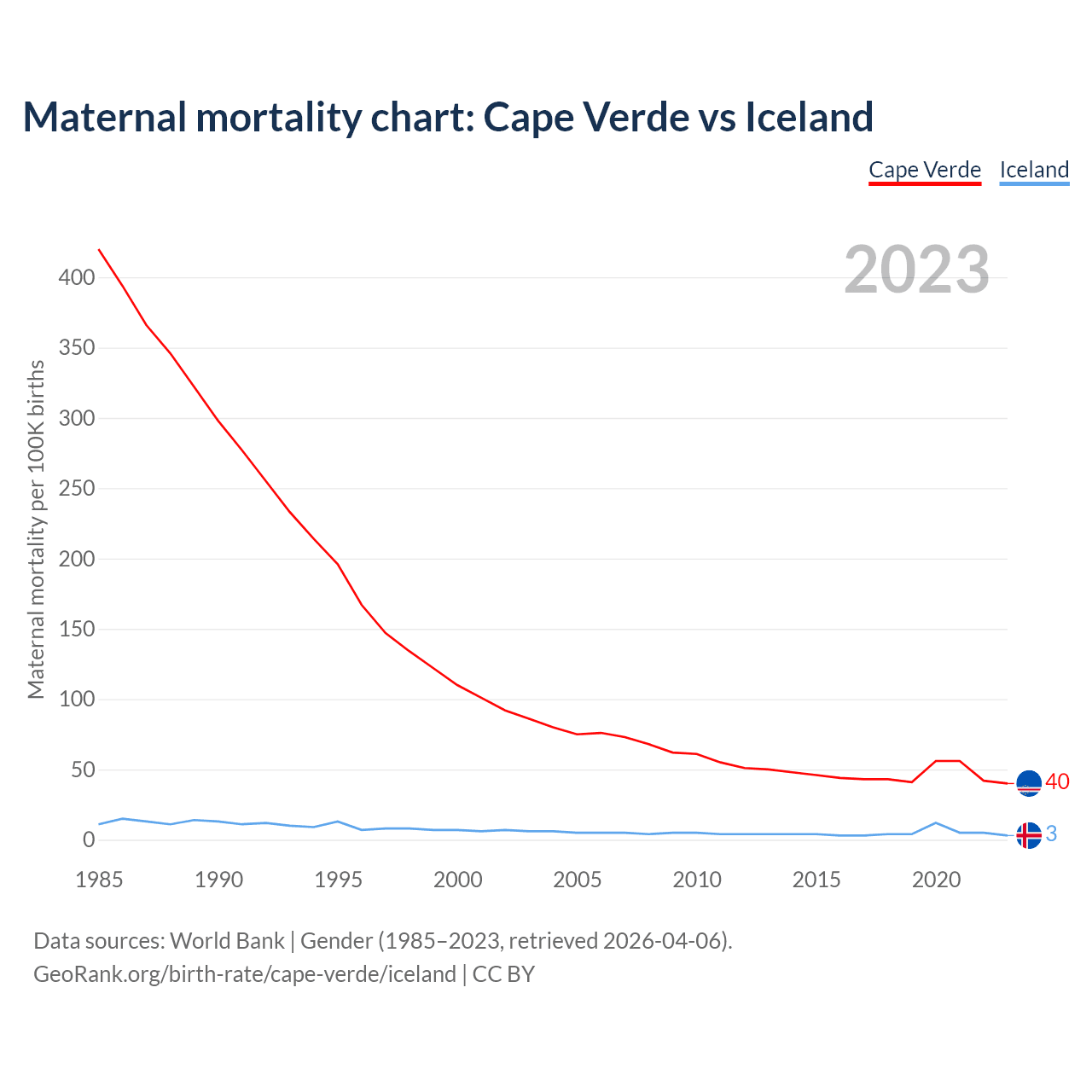 The maternal mortality rate, which is the probability of dying during childbirth or within 42 days of pregnancy termination, is 40 deaths per 100,000 live births in Cape Verde, compared to 3 deaths in Iceland.