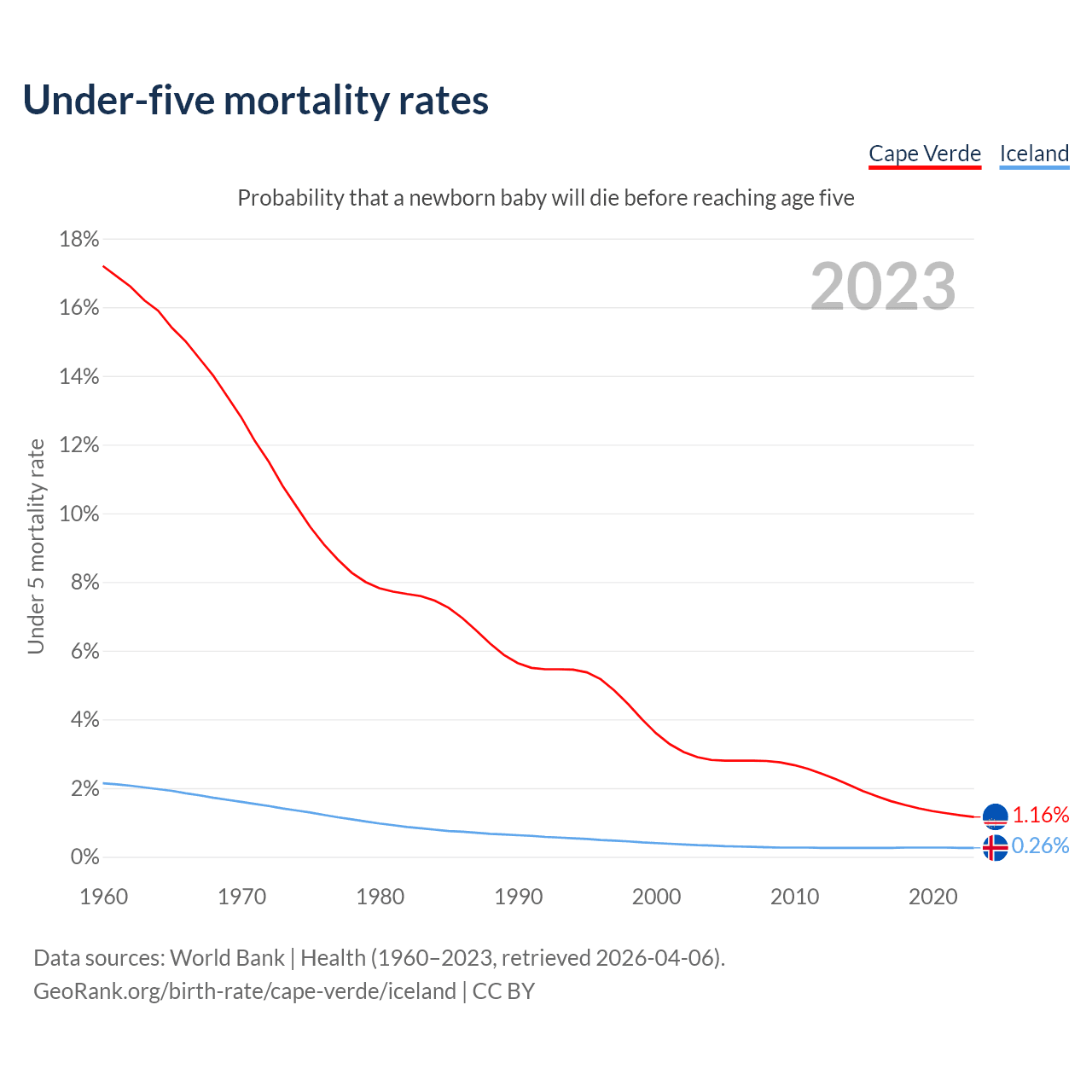 The chance that a newborn baby will die before reaching age five is 1.16% in Cape Verde and 0.26% in Iceland. Above is a chart with historical data on under-five mortality rates.
