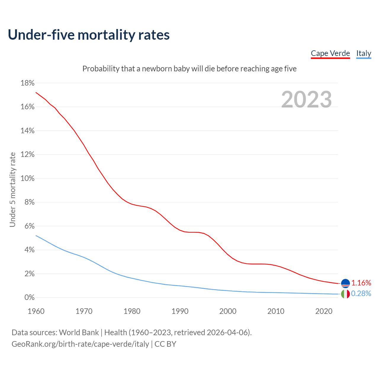The chance that a newborn baby will die before reaching age five is 1.16% in Cape Verde and 0.28% in Italy. Above is a chart with historical data on under-five mortality rates.