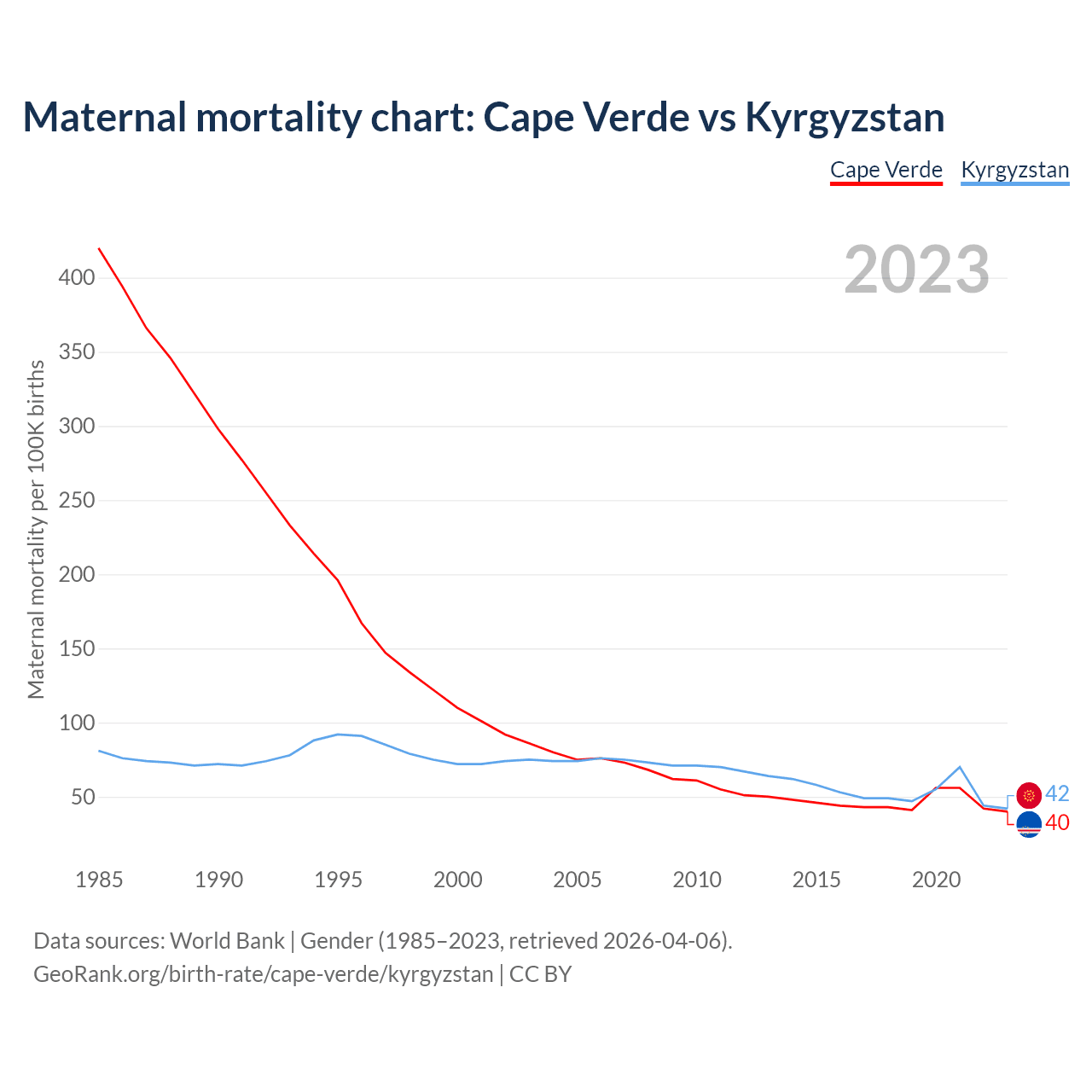 The maternal mortality rate, which is the probability of dying during childbirth or within 42 days of pregnancy termination, is 40 deaths per 100,000 live births in Cape Verde, compared to 42 deaths in Kyrgyzstan.
