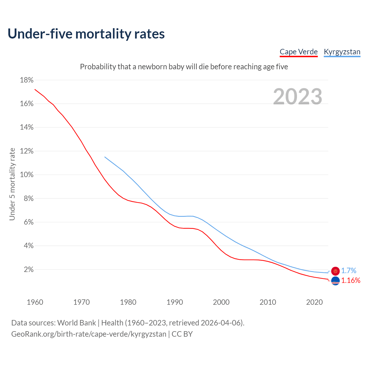 The chance that a newborn baby will die before reaching age five is 1.16% in Cape Verde and 1.7% in Kyrgyzstan. Above is a chart with historical data on under-five mortality rates.