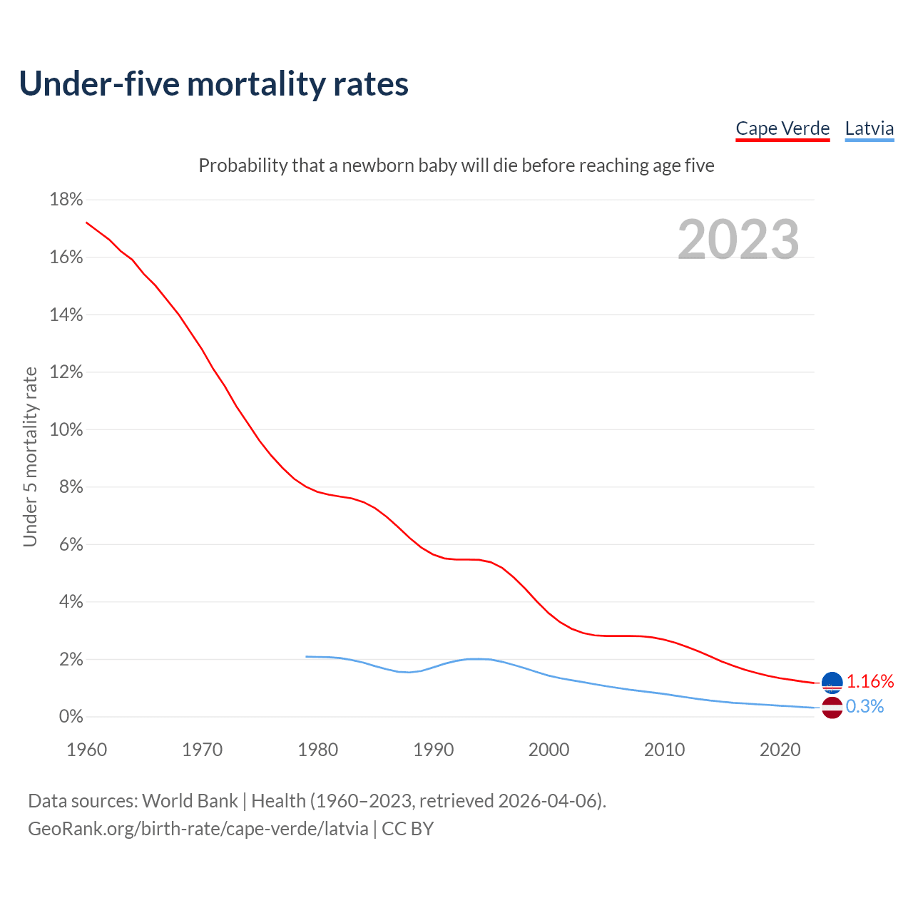 The chance that a newborn baby will die before reaching age five is 1.16% in Cape Verde and 0.3% in Latvia. Above is a chart with historical data on under-five mortality rates.