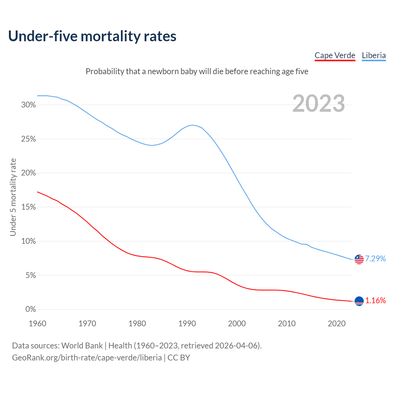 The chance that a newborn baby will die before reaching age five is 1.16% in Cape Verde and 7.29% in Liberia. Above is a chart with historical data on under-five mortality rates.
