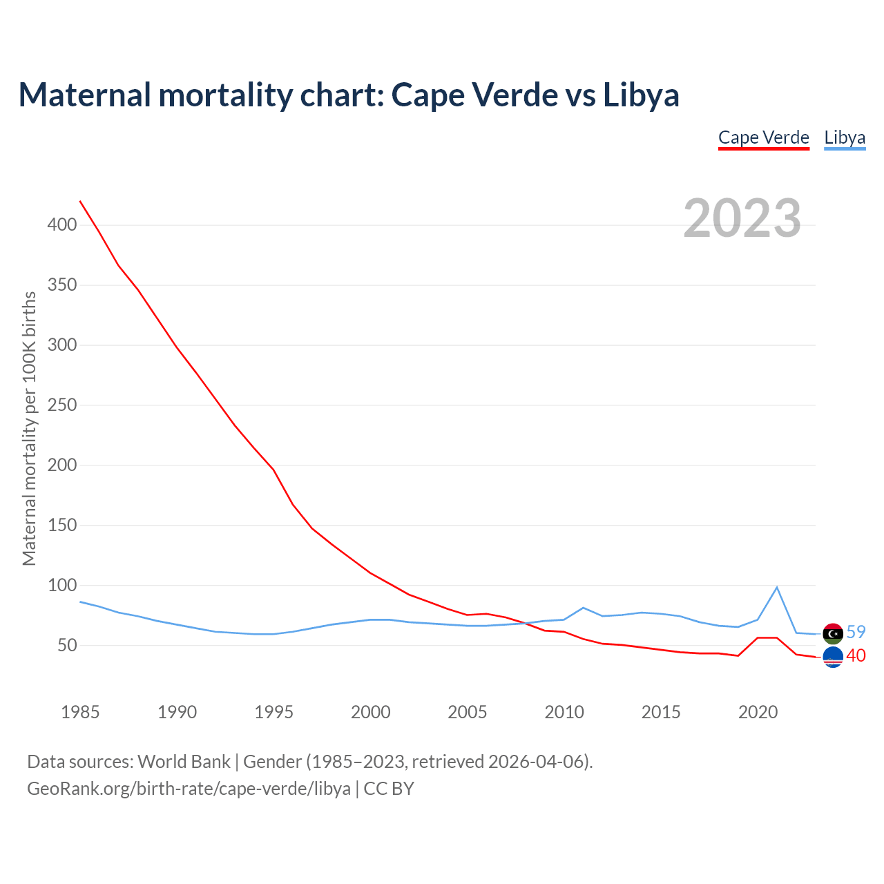 The maternal mortality rate, which is the probability of dying during childbirth or within 42 days of pregnancy termination, is 40 deaths per 100,000 live births in Cape Verde, compared to 59 deaths in Libya.