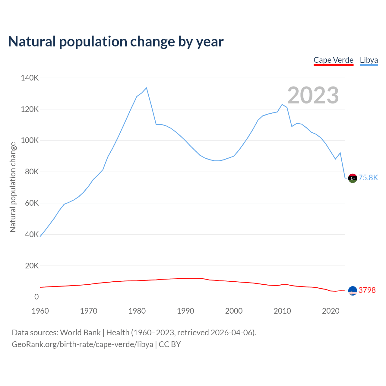 According to the latest available data on birth rates, the fertility rate in Cape Verde was 1.52 children per woman in 2023, compared to 2.36 in Libya in 2023. The replacement level is considered to be 2.1 children per woman.