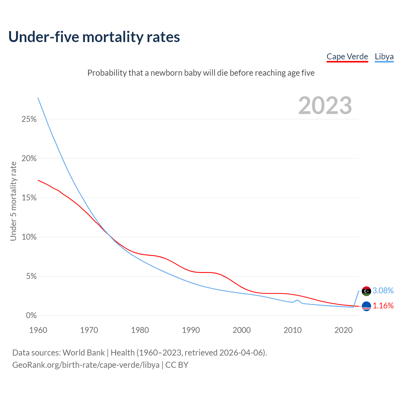 The chance that a newborn baby will die before reaching age five is 1.16% in Cape Verde and 3.08% in Libya. Above is a chart with historical data on under-five mortality rates.