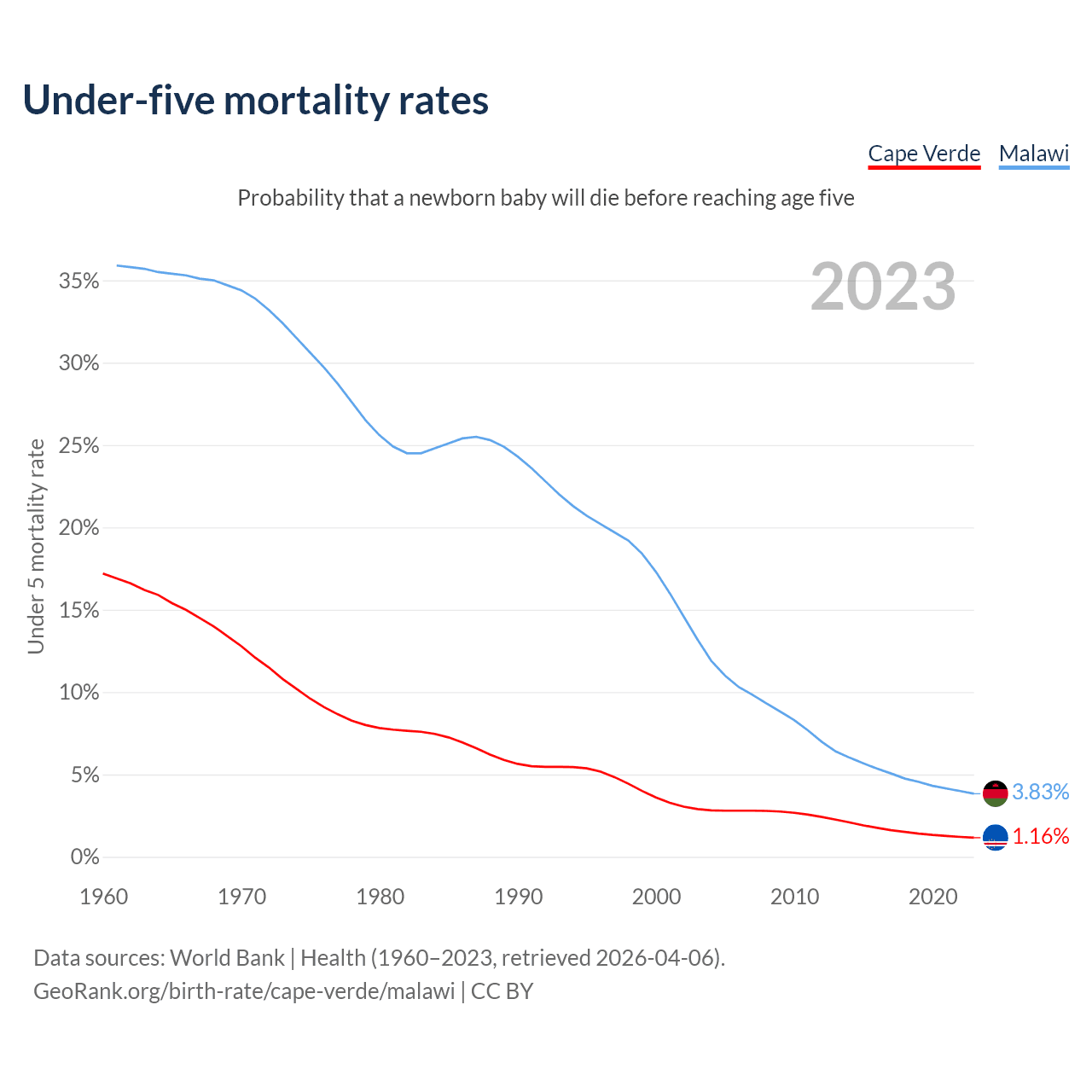 The chance that a newborn baby will die before reaching age five is 1.16% in Cape Verde and 3.83% in Malawi. Above is a chart with historical data on under-five mortality rates.