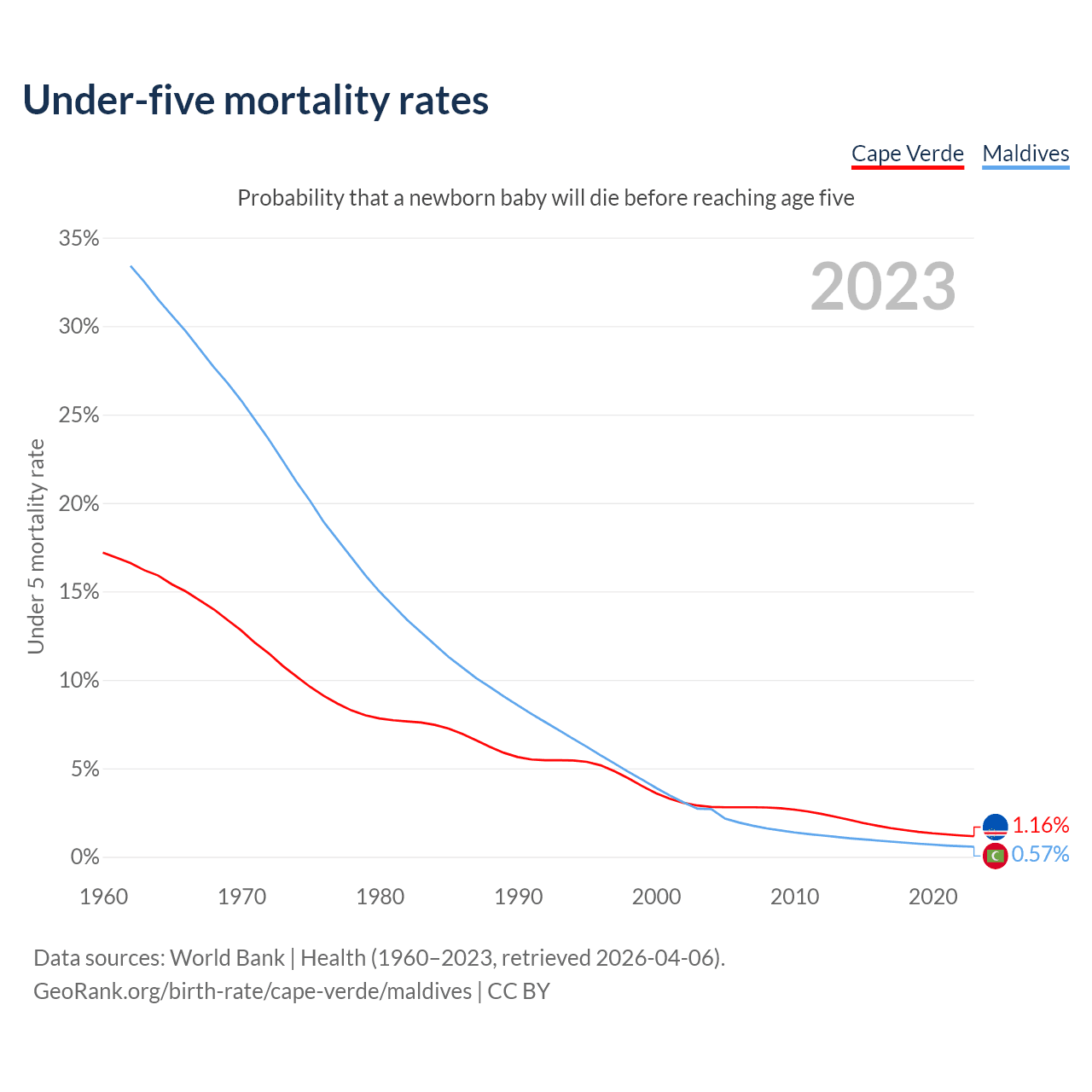 The chance that a newborn baby will die before reaching age five is 1.16% in Cape Verde and 0.57% in Maldives. Above is a chart with historical data on under-five mortality rates.