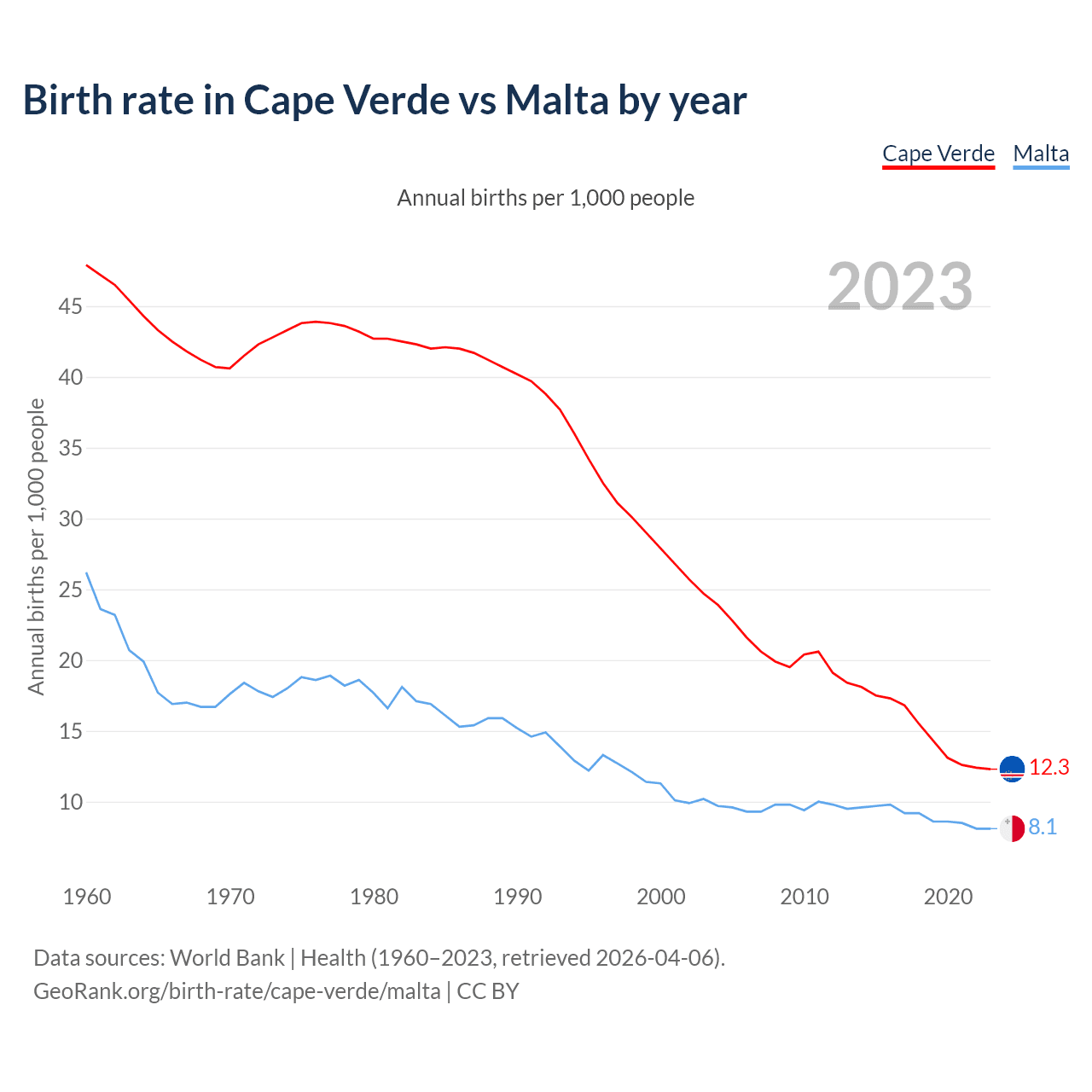 Cape Verde has an annual birth rate of 12.3 births per 1,000 people, compared to 8.1 for Malta. The average number of children a woman is expected to have during her lifetime — the fertility rate, is 1.52 in Cape Verde and 1.06 in Malta — 30.4% difference.
