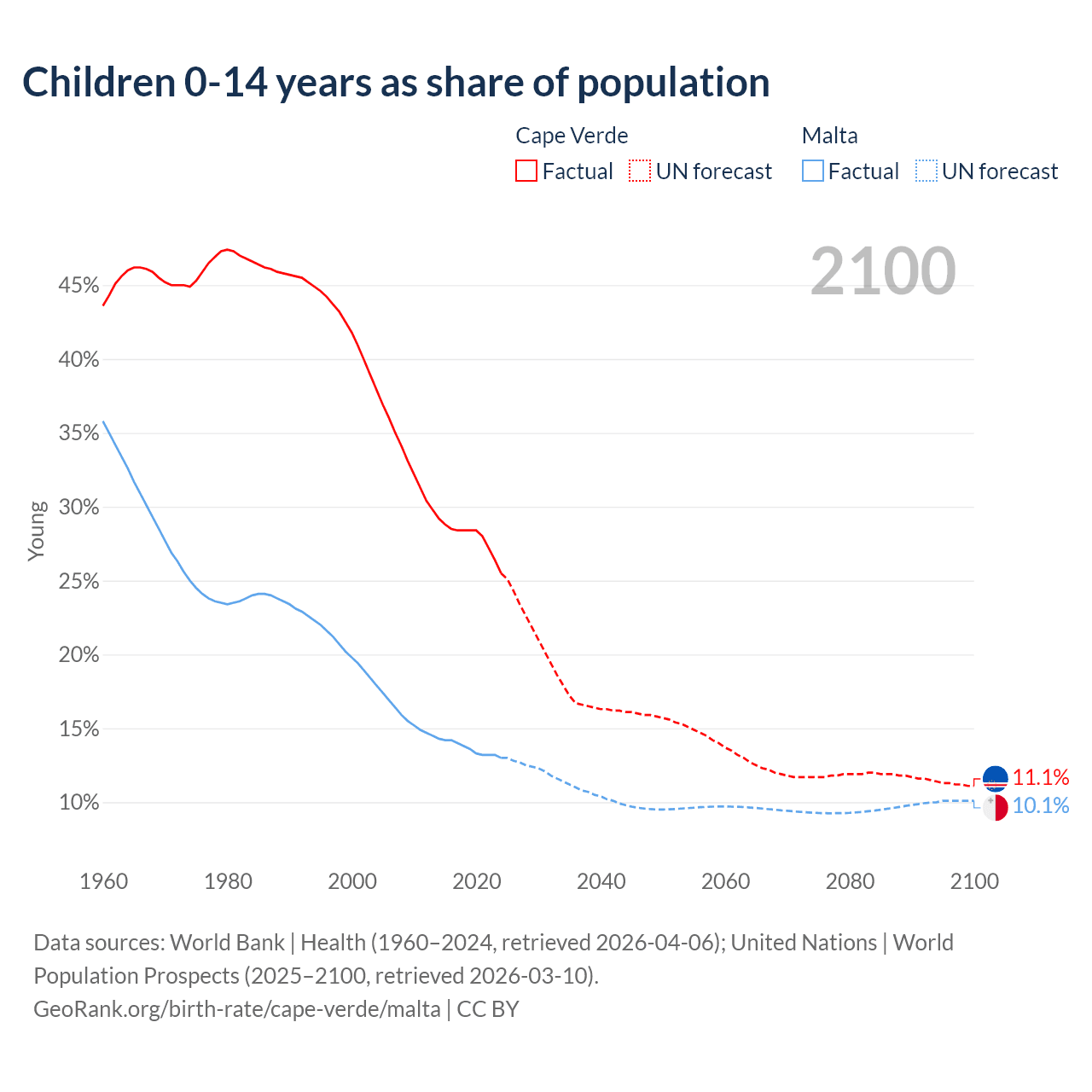 According to the latest available data on birth rates, the fertility rate in Cape Verde was 1.52 children per woman in 2023, compared to 1.06 in Malta in 2023. The replacement level is considered to be 2.1 children per woman.
